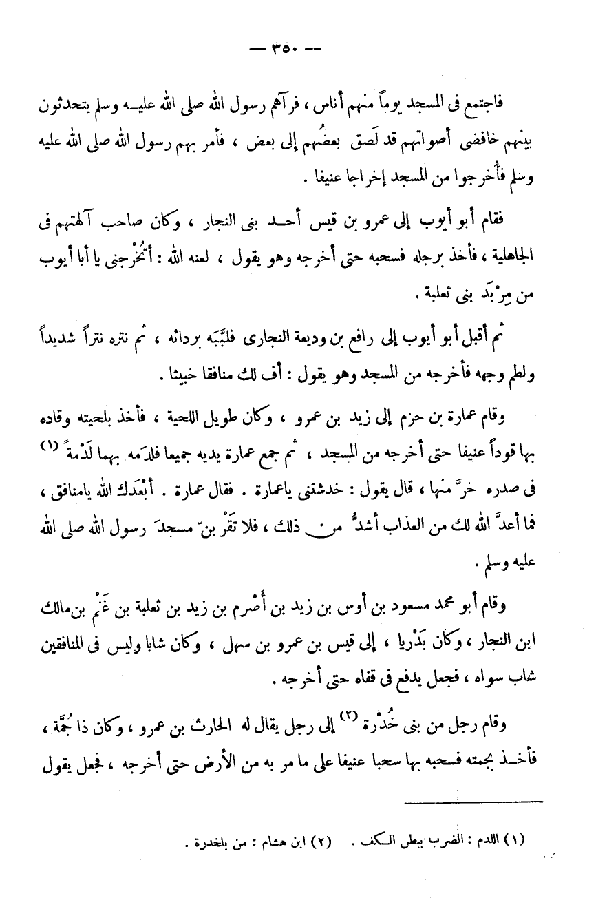 فَاجْتَمَعَ فِي الْمَسْجِدِ يَوْمًا مِنْهُمْ أُنَاسٌ، فَرَآهُمْ رَسُولُ اللَّهِ صَلَّى اللَّهُ عَلَيْهِ وَسَلَّمَ يَتَحَدَّثُونَ بَيْنَهُمْ خَافِضِي أَصْوَاتِهُمْ قَدْ لَصَقَ بَعْضُهُمْ إِلَى بَعْضٍ، فَأَمَرَ بِهِمْ رَسُولُ اللَّهِ صَلَّى اللَّهُ عَلَيْهِ وَسَلَّمَ فَأُخْرِجُوا مِنَ الْمَسْجِدِ إِخْرَاجًا عَنِيفًا.