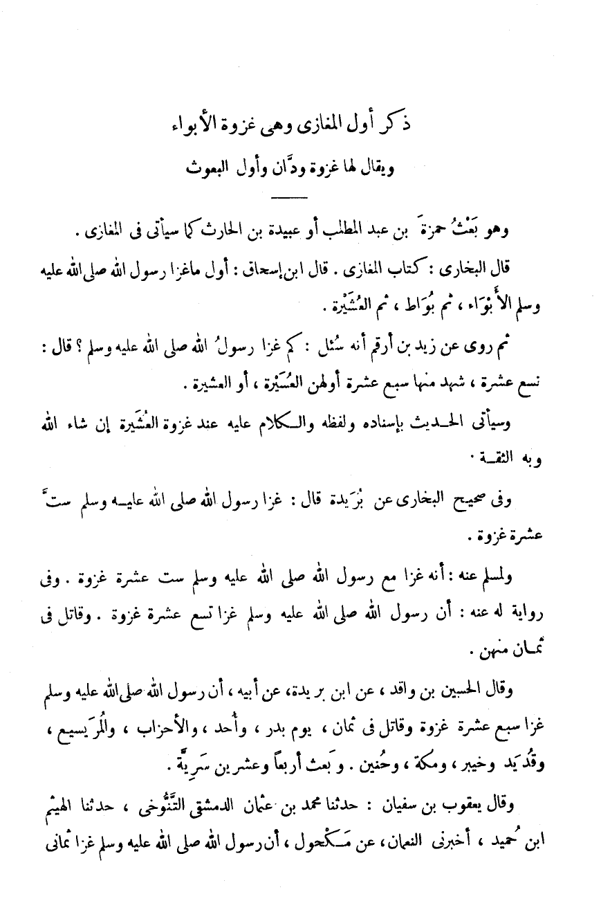 ثُمَّ رَوَى عَنْ زَيْدِ بْنِ أَرْقَمَ أَنَّهُ سُئِلَ: كَمْ غَزَا رَسُولُ اللَّهِ صَلَّى اللَّهُ عَلَيْهِ وَسَلَّمَ؟ قَالَ: تِسْعَ عَشْرَةَ، شَهِدَ مِنْهَا سَبْعَ عَشْرَةَ أَوَّلُهُنَّ الْعُسَيْرَةُ، أَوِ الْعُشَيْرَةُ.