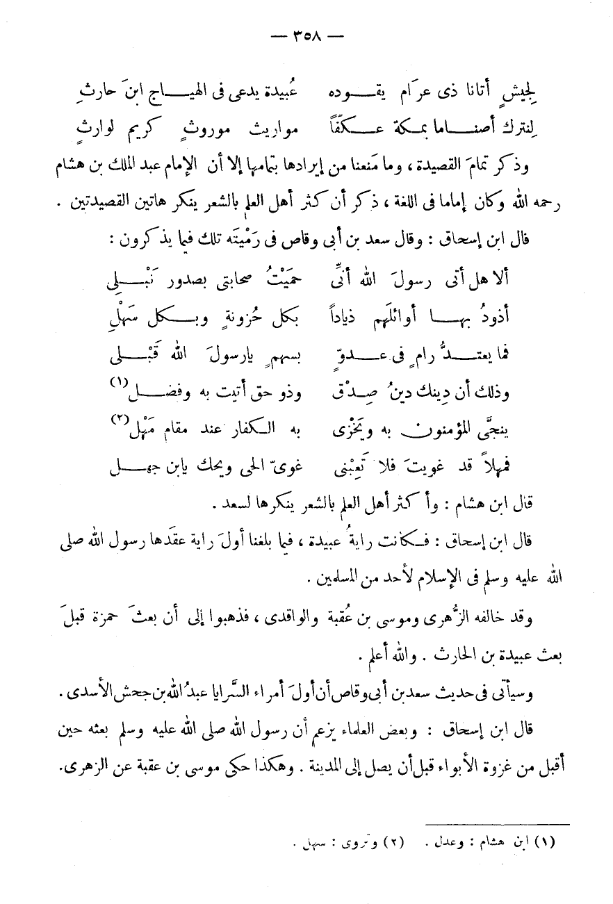 لِجَيْشٍ أَتَانَا ذِي عُرَامٍ يَقُودُهُ * عُبَيْدَةُ يُدْعَى فِي الْهِيَاجِ ابْنَ حَارِثِ لِنَتْرُكَ أَصْنَامًا بِمَكَّةَ عُكَّفًا * مَوَارِيثَ مَوْرُوثٍ كَرِيمٍ لِوَارِثِ وَذَكَرَ تَمَامَ الْقَصِيدَةِ، وَمَا مَنَعَنَا مِنْ إِيرَادِهَا بِتَمَامِهَا إِلَّا أَنَّ الْإِمَامَ عَبْدَ الْمَلِكِ بْنَ هِشَامٍ رَحِمَهُ اللَّهُ وَكَانَ إِمَامًا فِي اللُّغَةِ، ذَكَرَ أَنَّ كثر أَهْلِ الْعِلْمِ بِالشِّعْرِ يُنْكِرُ هَاتَيْنِ الْقَصِيدَتَيْنِ.