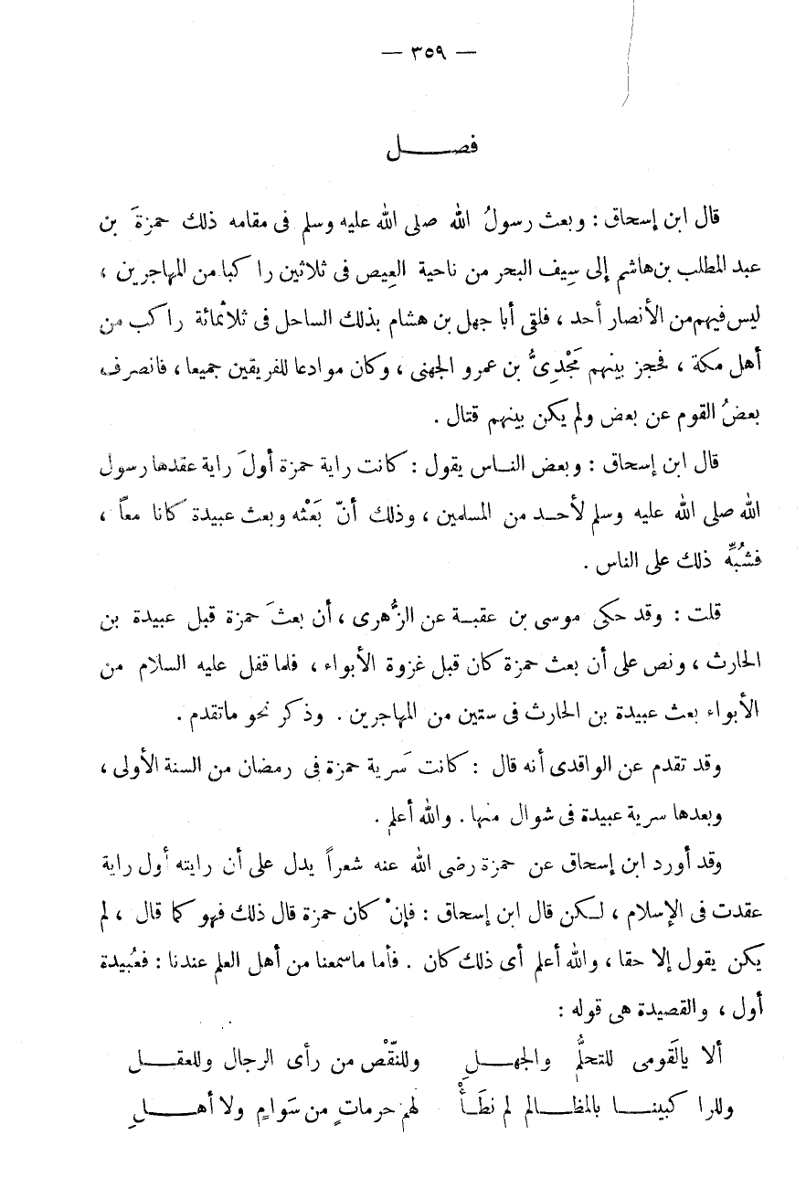 فَصْلٌ قَالَ ابْنُ إِسْحَاقَ: وَبَعَثَ رَسُولُ اللَّهِ صَلَّى اللَّهُ عَلَيْهِ وَسَلَّمَ فِي مقَامه ذَلِك حَمْزَةَ بْنَ عَبْدِ الْمُطَّلِبِ بْنِ هَاشِمٍ إِلَى سَيْفِ الْبَحْرِ مِنْ نَاحِيَةِ الْعِيصِ فِي ثَلَاثِينَ رَاكِبًا مِنَ الْمُهَاجِرِينَ، لَيْسَ فِيهِمْ مِنَ الْأَنْصَارِ أَحَدٌ، فَلَقِيَ أَبَا جَهْلِ بْنَ هِشَامٍ بِذَلِكَ السَّاحِلِ فِي ثَلَاثِمَائَةِ رَاكِبٍ مِنْ أَهْلِ مَكَّةَ، فَحَجَزَ بَيْنَهُمْ مَجْدِيُّ بْنُ عَمْرٍو الْجُهَنِيُّ، وَكَانَ مُوَادِعًا لِلْفَرِيقَيْنِ جَمِيعًا، فَانْصَرَفَ بَعْضُ الْقَوْمِ عَنْ بَعْضٍ وَلَمْ يَكُنْ بَيْنَهُمْ قِتَالٌ.