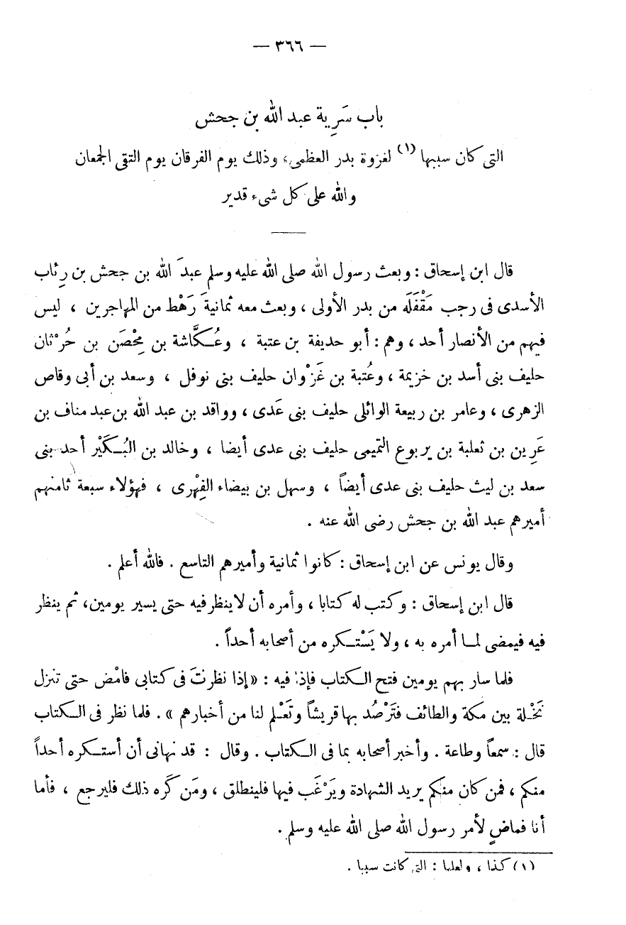 الَّتِى كَانَ سَببهَا (1) لِغَزْوَةِ بَدْرٍ الْعُظْمَى، وَذَلِكَ يَوْمَ الْفُرْقَانِ يَوْمَ التقى الْجَمْعَانِ وَالله على كل شئ قَدِيرٌ قَالَ ابْنُ إِسْحَاقَ: وَبَعَثَ رَسُولُ اللَّهِ صَلَّى اللَّهُ عَلَيْهِ وَسَلَّمَ عَبْدَ اللَّهِ بْنَ جَحْشِ بْنِ رِئَابٍ الْأَسَدِيَّ فِي رَجَبٍ مَقْفَلَهُ مِنْ بَدْرٍ الْأُولَى، وَبَعَثَ مَعَهُ ثَمَانِيَةَ رَهْطٍ مِنَ الْمُهَاجِرِينَ، لَيْسَ فِيهِمْ مِنَ الْأَنْصَارِ أَحَدٌ، وهم أَبُو حديفة بْنُ عُتْبَةَ، وَعُكَّاشَةُ بْنُ مِحْصَنِ بْنِ حُرْثَانَ حَلِيفُ بَنِي أَسَدِ بْنِ خُزَيْمَةَ، وَعُتْبَةُ بْنُ غَزْوَانَ حَلِيفُ بَنِي نَوْفَلٍ، وَسَعْدُ بْنُ أَبِي وَقَّاصٍ الزُّهْرِيُّ، وَعَامِرُ بْنُ رَبِيعَةَ الْوَائِلِيُّ حَلِيفُ بَنِي عَدِيٍّ، وَوَاقَدُ بْنُ عَبْدِ اللَّهِ بْنِ عَبْدِ مَنَافِ بْنِ عَرِينِ بْنِ ثَعْلَبَةَ بْنِ يَرْبُوعٍ التَّمِيمِيُّ حَلِيفُ بَنِي عَدِيٍّ أَيْضًا، وَخَالِدُ بْنُ الْبُكَيْرِ أَحَدُ بَنِي سَعْدِ بْنِ لَيْثٍ حَلِيف بنى عدى أَيْضا، وَسَهل بن بَيْضَاءَ الْفِهْرِيُّ، فَهَؤُلَاءِ سَبْعَةٌ ثَامِنُهُمْ أَمِيرُهُمْ عَبْدُ اللَّهِ بْنُ جَحْشٍ رَضِيَ اللَّهُ عَنْهُ.