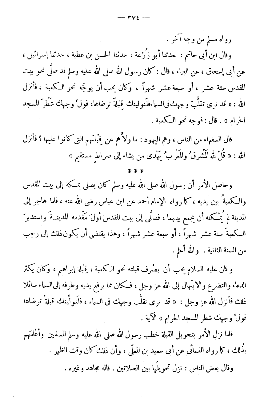 وَقَالَ ابْنُ أَبِي حَاتِمٍ: حَدَّثَنَا أَبُو زُرْعَةَ، حَدَّثَنَا الْحَسَنُ بْنُ عَطِيَّةَ، حَدَّثَنَا إِسْرَائِيلُ، عَنْ أَبِي إِسْحَاقَ، عَنِ الْبَرَاءِ، قَالَ: كَانَ رَسُولُ اللَّهِ صَلَّى اللَّهُ عَلَيْهِ وَسَلَّمَ قَدْ صَلَّى نَحْوَ بَيْتِ الْمَقْدِسِ سِتَّةَ عَشَرَ، أَوْ سَبْعَةَ عَشَرَ شَهْرًا، وَكَانَ يُحِبُّ أَنْ يُوَجَّهَ نَحْوَ الْكَعْبَةِ، فَأَنْزَلَ اللَّهُ: " قَدْ نَرَى تَقَلُّبَ وَجْهِكَ فِي السَّمَاءِ فَلَنُوَلِّيَنَّكَ قِبْلَةً تَرْضَاهَا، فَوَلِّ وَجْهَكَ شَطْرَ الْمَسْجِدِ الْحَرَامِ ".