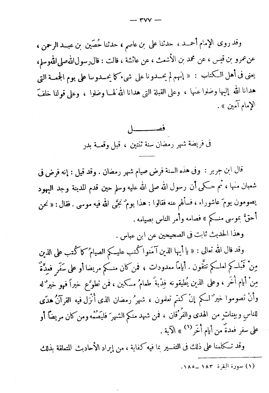 أَيَّامًا مَعْدُودَاتٍ، فَمَنْ كَانَ مِنْكُمْ مَرِيضًا أَوْ عَلَى سَفَرٍ فَعِدَّةٌ مِنْ أَيَّامٍ أُخَرَ، وَعَلَى الَّذِينَ يُطِيقُونَهُ فِدْيَةٌ طَعَامُ مِسْكِينٍ، فَمَنْ تَطَوَّعَ خَيْرًا فَهُوَ خَيْرٌ لَهُ وَأَنْ تَصُومُوا خَيْرٌ لَكُمْ إِنْ كُنْتُمْ تَعْلَمُونَ، شَهْرُ رَمَضَانَ الَّذِي أُنْزِلَ فِيهِ الْقُرْآنُ هُدًى لِلنَّاسِ وَبَيِّنَاتٍ مِنَ الْهُدَى وَالْفُرْقَانِ، فَمَنْ شَهِدَ مِنْكُمُ الشَّهْرَ فَلْيَصُمْهُ وَمَنْ كَانَ مَرِيضًا أَوْ عَلَى سفر فَعدَّة من أَيَّام أخر (1) " الْآيَة.