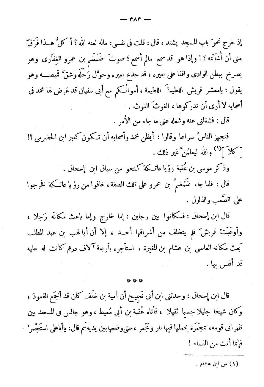 إِذْ خَرَجَ نَحْوَ بَابِ الْمَسْجِدِ يَشْتَدُّ، قَالَ: قُلْتُ فِي نَفْسِي، مَا لَهُ لَعَنَهُ اللَّهُ؟ أَكُلُّ هَذَا فَرَقٌ مِنِّي أَنْ أُشَاتِمَهُ؟ ! وَإِذَا هُوَ قَدْ سَمِعَ مَا لَمْ أَسْمَعْ، صَوْتَ ضَمْضَمِ بْنِ عَمْرٍو الْغِفَارِيِّ وَهُوَ يَصْرُخُ بِبَطْنِ الْوَادِي وَاقِفًا عَلَى بَعِيرِهِ، قَدْ جَدَّعَ بَعِيرَهُ وَحَوَّلَ رَحْلَهُ وَشَقَّ قَمِيصَهُ وَهُوَ يَقُولُ: يَا مَعْشَرَ قُرَيْشٍ اللَّطِيمَةَ اللَّطِيمَةَ، أَمْوَالُكُمْ مَعَ أَبِي سُفْيَانَ قَدْ عَرَضَ لَهَا مُحَمَّدٌ فِي أَصْحَابِهِ لَا أَرَى أَنْ تُدْرِكُوهَا، الْغَوْثَ الْغَوْثَ.