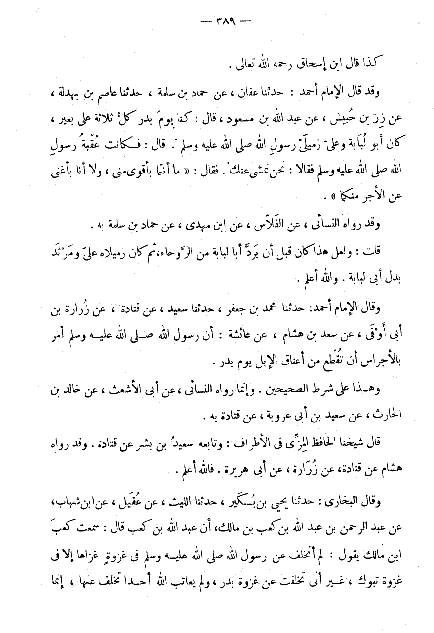وَقَدْ قَالَ الْإِمَامُ أَحْمَدُ: حَدَّثَنَا عَفَّانُ، عَنْ حَمَّادِ بْنِ سَلَمَةَ، حَدَّثَنَا عَاصِمِ بْنِ بَهْدَلَةَ، عَنْ زِرِّ بْنِ حُبَيْشٍ، عَنْ عَبْدِ اللَّهِ بْنِ مَسْعُودٍ، قَالَ كُنَّا يَوْمَ بَدْرٍ كُلُّ ثَلَاثَةٍ عَلَى بَعِيرٍ، كَانَ أَبُو لُبَابَةَ وَعَلِيٌّ زَمِيلَيْ رَسُولِ اللَّهِ صَلَّى اللَّهُ عَلَيْهِ وَسَلَّمَ.