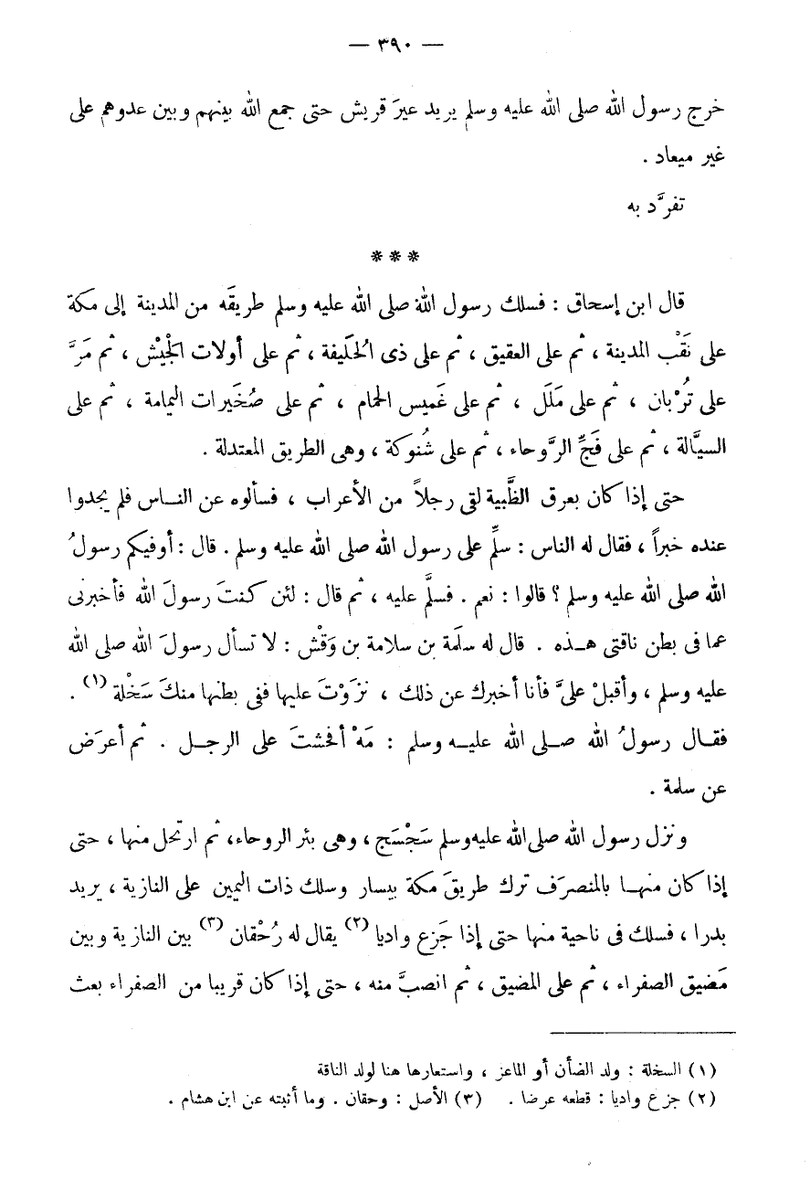 وَنَزَلَ رَسُولُ اللَّهِ صَلَّى اللَّهُ عَلَيْهِ وَسَلَّمَ سَجْسَجَ، وَهِيَ بِئْرُ الرَّوْحَاءِ، ثُمَّ ارْتَحَلَ مِنْهَا، حَتَّى إِذَا كَانَ مِنْهَا بِالْمُنْصَرَفِ تَرَكَ طَرِيقَ مَكَّةَ بِيَسَارٍ وَسَلَكَ ذَاتَ الْيَمِينِ عَلَى النَّازِيَةِ، يُرِيدُ بَدْرًا، فَسَلَكَ فِي نَاحِيَةٍ مِنْهَا حَتَّى إِذَا جَزَعَ وَادِيًا (2) يُقَالُ لَهُ رُحْقَانُ (3) بَيْنَ النَّازِيَةِ وَبَيْنَ مَضِيقِ الصَّفْرَاءِ، ثُمَّ عَلَى الْمَضِيقِ، ثُمَّ انْصَبَّ مِنْهُ، حَتَّى إِذَا كَانَ قَرِيبًا من الصَّفْرَاء بعث