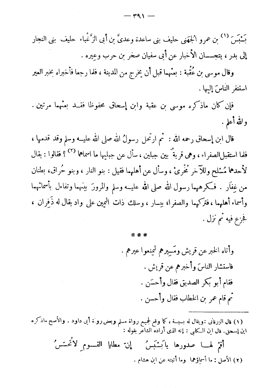 بَسْبَسَ (1) بْنَ عَمْرٍو الْجُهَنِيَّ حَلِيفَ بَنِي سَاعِدَةَ وَعَدِيَّ بْنَ أَبِي الزَّغْبَاءِ حَلِيفَ بَنِي النَّجَّارِ إِلَى بدر، يتجسسان الْأَخْبَارَ عَنْ أَبِي سُفْيَانَ صَخْرِ بْنِ حَرْبٍ وَعِيرِهِ.
