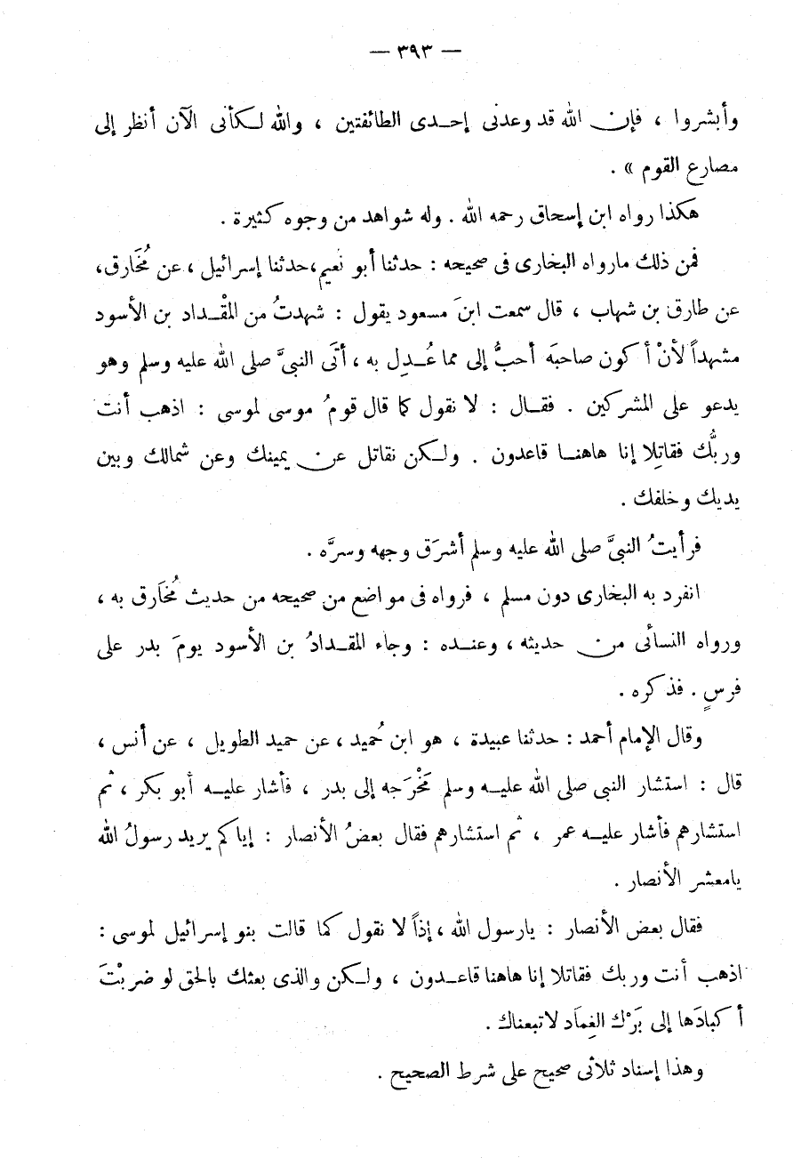 فَمِنْ ذَلِكَ مَا رَوَاهُ الْبُخَارِيُّ فِي صَحِيحِهِ: حَدَّثَنَا أَبُو نُعَيْمٍ، حَدَّثَنَا إِسْرَائِيلُ، عَنْ مُخَارِقٍ، عَنْ طَارِقِ بْنِ شِهَابٍ، قَالَ سَمِعْتُ ابْنَ مَسْعُودٍ يَقُولُ: شَهِدْتُ مِنَ الْمِقْدَادِ بْنِ الْأَسْوَدِ مَشْهَدًا لَأَنْ أَكُونَ صَاحِبَهُ أَحَبُّ إِلَيَّ مِمَّا عُدِلَ بِهِ، أَتَى النَّبِيَّ صَلَّى اللَّهُ عَلَيْهِ وَسَلَّمَ وَهُوَ يَدْعُو عَلَى الْمُشْرِكِينَ.