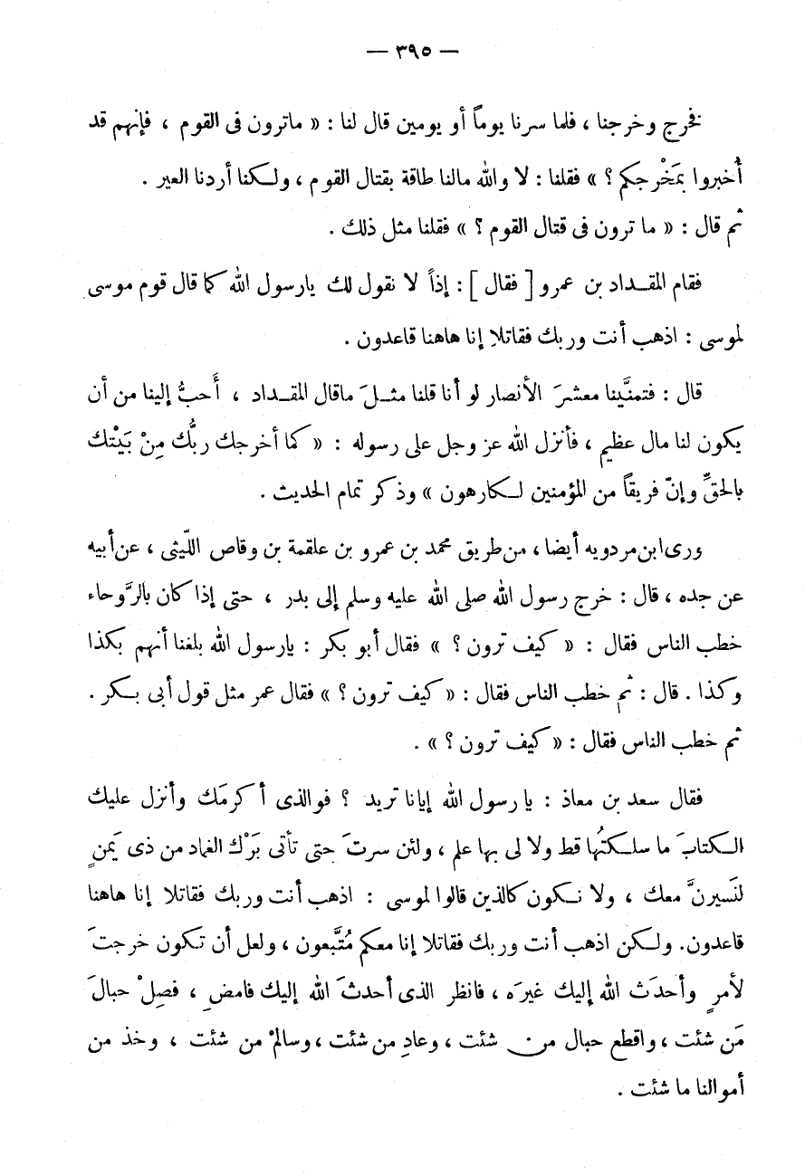 فَقَامَ الْمِقْدَاد بن عَمْرو [فَقَالَ] : إِذًا لَا نَقُولُ لَكَ يَا رَسُولَ اللَّهِ كَمَا قَالَ قَوْمُ مُوسَى لِمُوسَى: اذْهَبْ أَنْتَ وَرَبك فَقَاتلا إِنَّا هَا هُنَا قَاعِدُونَ.