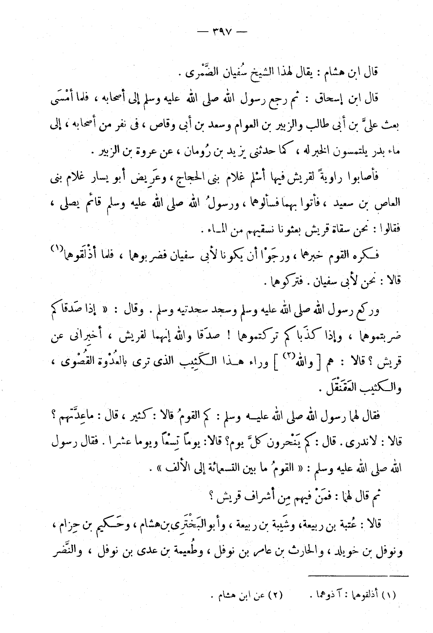 فَأَصَابُوا رَاوِيَةً لِقُرَيْشٍ فِيهَا أَسْلَمُ غُلَامُ بَنِي الْحَجَّاجِ، وَعَرِيضٌ أَبُو يَسَارٍ غُلَامُ بَنِي الْعَاصِ بْنِ سَعِيدٍ، فَأَتَوْا بِهِمَا فَسَأَلُوهُمَا، وَرَسُولُ اللَّهِ صَلَّى اللَّهُ عَلَيْهِ وَسَلَّمَ قَائِمٌ يُصَلِّي، فَقَالُوا: نَحْنُ سُقَاةُ قُرَيْشٍ بَعَثُونَا نَسْقِيهِمْ مِنَ الْمَاءِ.