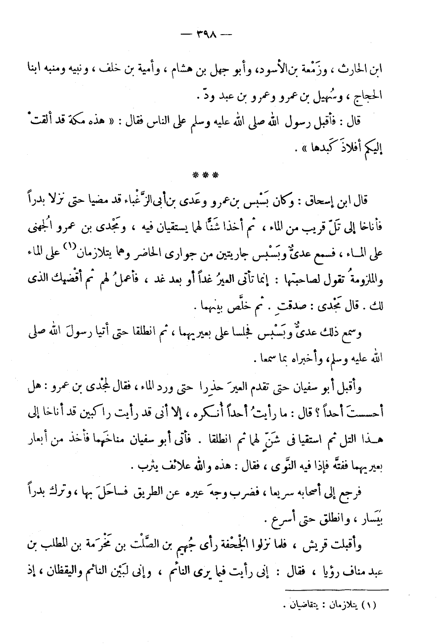وَأَقْبَلَ أَبُو سُفْيَانَ حَتَّى تَقَدَّمَ الْعِيرَ حَذِرًا حَتَّى وَرَدَ الْمَاءَ، فَقَالَ لِمَجْدِيِّ بْنِ عَمْرٍو: هَلْ أَحْسَسْتَ أَحَدًا؟ قَالَ: مَا رَأَيْتُ أَحَدًا أُنْكِرُهُ، إِلَّا أَنِّي قَدْ رَأَيْتُ رَاكِبَيْنِ قَدْ أَنَاخَا إِلَى هَذَا التَّلِّ ثُمَّ اسْتَقَيَا فِي شَنٍّ لَهُمَا ثُمَّ انْطَلَقَا.