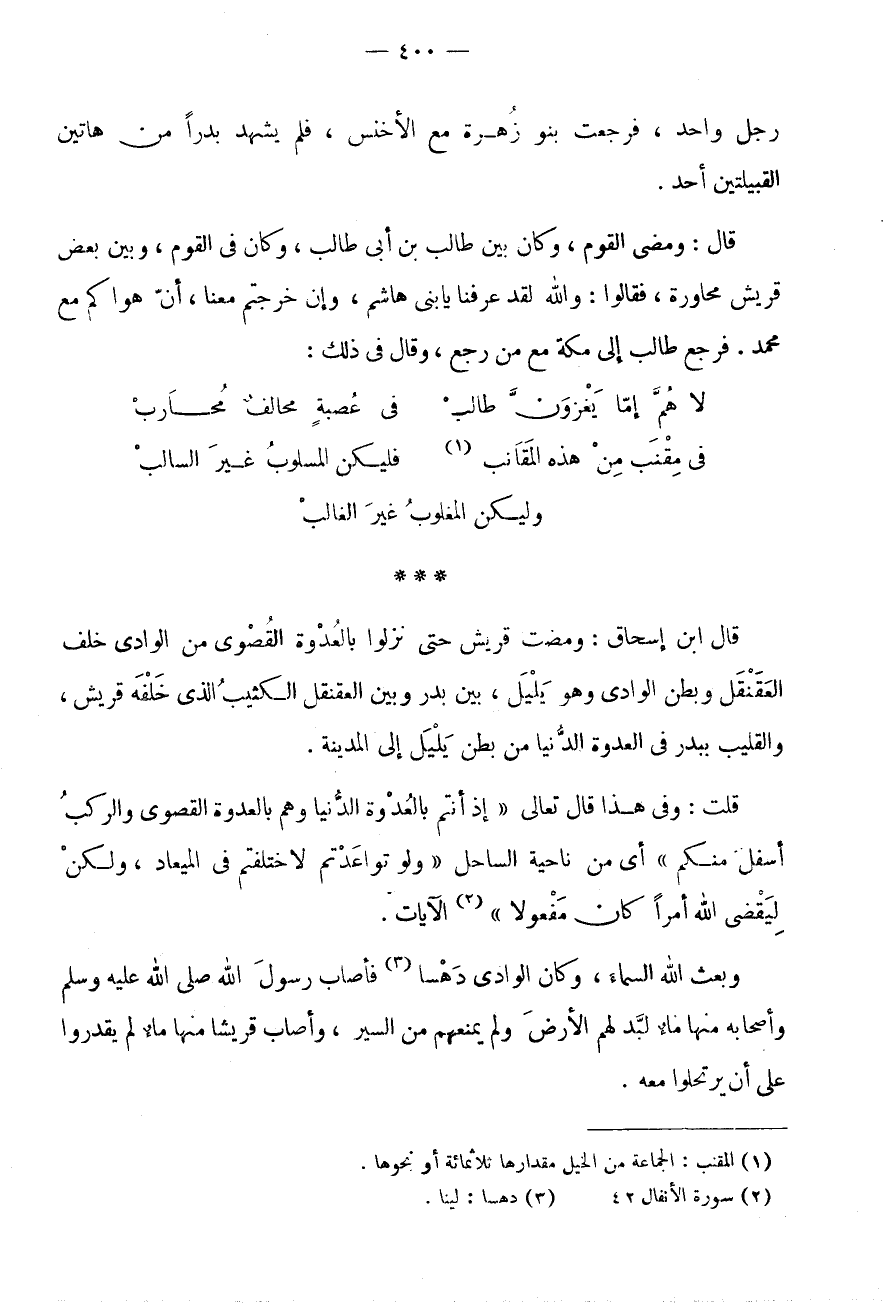 فَرَجَعَ طَالِبٌ إِلَى مَكَّةَ مَعَ من رَجَعَ، وَقَالَ فِي ذَلِك: لَا هم إِمَّا يَغْزُوَنَّ طَالِبْ * فِي عُصْبَةٍ مُحَالِفٌ مُحَارِبْ فِي مِقْنَبٍ مِنْ هَذِهِ الْمَقَانِبْ (1) * فَلْيَكُنِ الْمَسْلُوبُ غَيْرَ السَّالِبْ وَلِيَكُنِ الْمَغْلُوبُ غَيْرَ الْغَالِبْ * * * قَالَ ابْنُ إِسْحَاقَ: وَمَضَتْ قُرَيْشٌ حَتَّى نَزَلُوا بِالْعُدْوَةِ الْقُصْوَى مِنَ الْوَادِي خَلْفَ الْعَقَنْقَلِ وَبَطْنِ الْوَادِي وَهُوَ يَلْيَلُ، بَيْنَ بَدْرٍ وَبَيْنَ الْعَقَنْقَلِ الْكَثِيبِ الَّذِي خَلْفَهُ قُرَيْشٌ، وَالْقَلِيبُ بِبَدْرٍ فِي الْعُدْوَةِ الدُّنْيَا مِنْ بَطْنِ يَلْيَلَ إِلَى الْمَدِينَةِ.