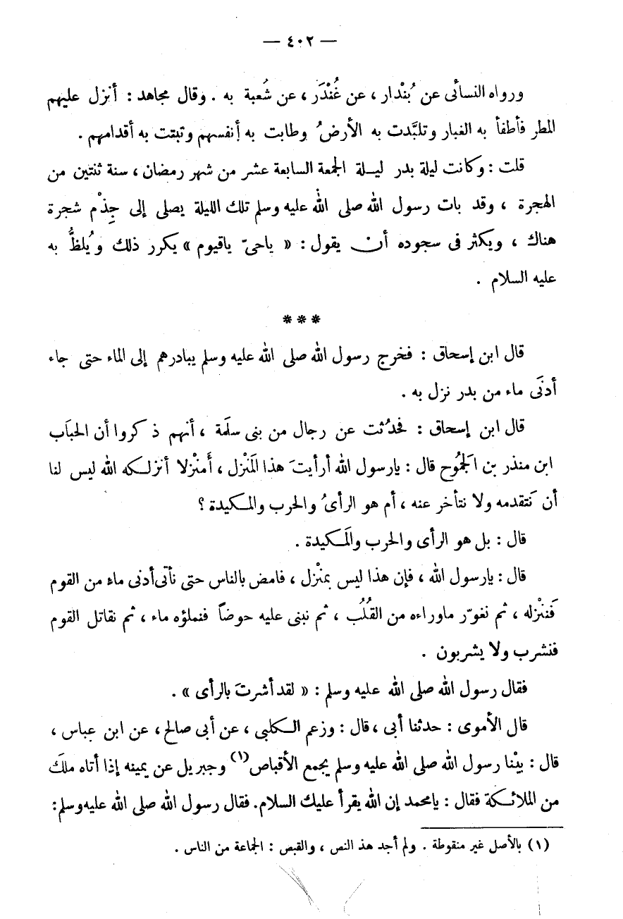 قَالَ ابْنُ إِسْحَاقَ: فَحُدِّثْتُ عَنْ رِجَالٍ مِنْ بنى سَلمَة، أَنهم ذكرُوا أَن الْحباب ابْن مُنْذر بْنِ الْجَمُوحِ قَالَ: يَا رَسُولَ اللَّهِ أَرَأَيْتَ هَذَا الْمَنْزِلَ، أَمَنْزِلًا أَنْزَلَكَهُ اللَّهُ لَيْسَ لَنَا أَنْ نَتَقَدَّمَهُ وَلَا نَتَأَخَّرَ عَنْهُ، أَمْ هُوَ الرَّأْيُ وَالْحَرْبُ وَالْمَكِيدَةُ؟