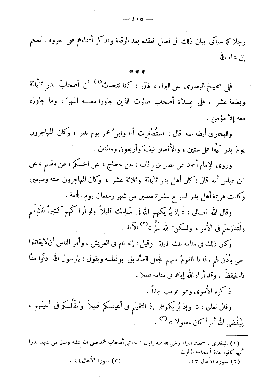 * * * فَفِي صَحِيحِ الْبُخَارِيِّ عَنِ الْبَرَاءِ، قَالَ: كُنَّا نَتَحَدَّثُ (1) أَنَّ أَصْحَابَ بدر ثلثمِائة وَبِضْعَةَ عَشَرَ، عَلَى عِدَّةِ أَصْحَابِ طَالُوتَ الَّذِينَ جاوزا مَعَهُ النَّهْرَ، وَمَا جَاوَزَهُ مَعَهُ إِلَّا مُؤْمِنٌ.