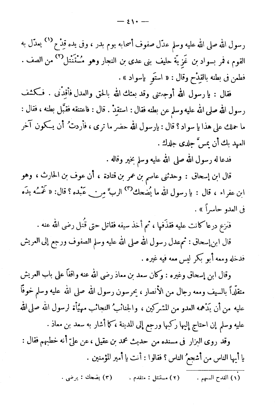 رَسُولَ اللَّهِ صَلَّى اللَّهُ عَلَيْهِ وَسَلَّمَ عَدَّلَ صُفُوفَ أَصْحَابِهِ يَوْمَ بَدْرٍ، وَفِي يَدِهِ قِدْحٌ (1) يُعَدِّلُ بِهِ الْقَوْمَ، فَمَرَّ بِسَوَادِ بْنِ غَزِيَّةَ حَلِيفِ بَنِي عَدِيِّ بْنِ النَّجَّارِ وَهُوَ مُسْتَنْتِلٌ (2) مِنَ الصَّفِّ.