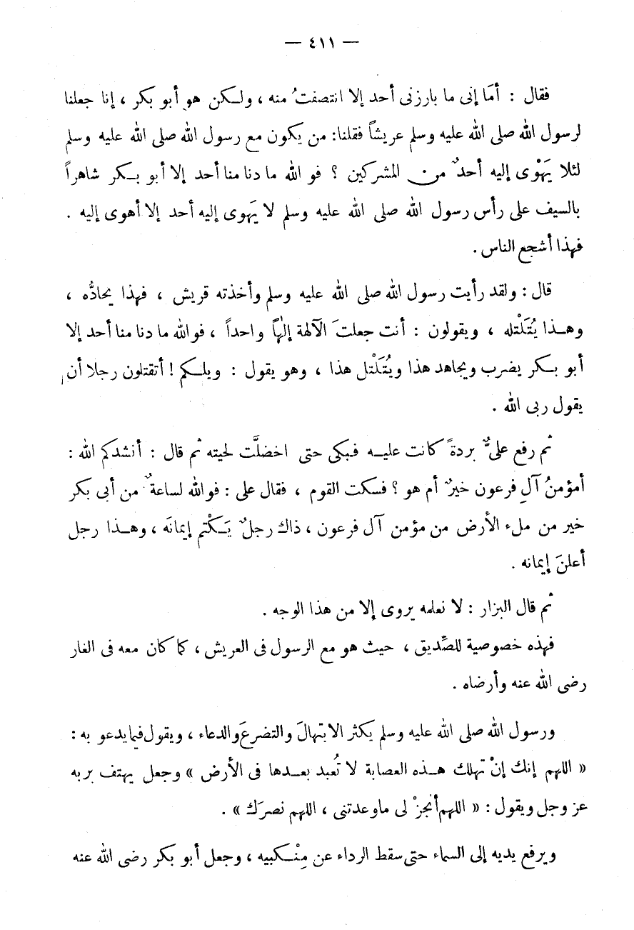 فَقَالَ: أَمَا إِنِّي مَا بَارَزَنِي أَحَدٌ إِلَّا انْتَصَفْتُ مِنْهُ، وَلَكِنْ هُوَ أَبُو بَكْرٍ، إِنَّا جَعَلْنَا لِرَسُولِ اللَّهِ صَلَّى اللَّهُ عَلَيْهِ وَسَلَّمَ عَرِيشًا فَقُلْنَا: مَنْ يَكُونُ مَعَ رَسُولِ اللَّهِ صَلَّى اللَّهُ عَلَيْهِ وَسَلَّمَ لِئَلَّا يَهْوِي إِلَيْهِ أحد من الْمُشْركين؟ فو الله مَا دَنَا مِنَّا أَحَدٌ إِلَّا أَبُو بَكْرٍ شَاهِرًا بِالسَّيْفِ عَلَى رَأْسِ رَسُولِ اللَّهِ صَلَّى اللَّهُ عَلَيْهِ وَسَلَّمَ لَا يَهْوِي إِلَيْهِ أَحَدٌ إِلَّا أَهْوَى إِلَيْهِ.