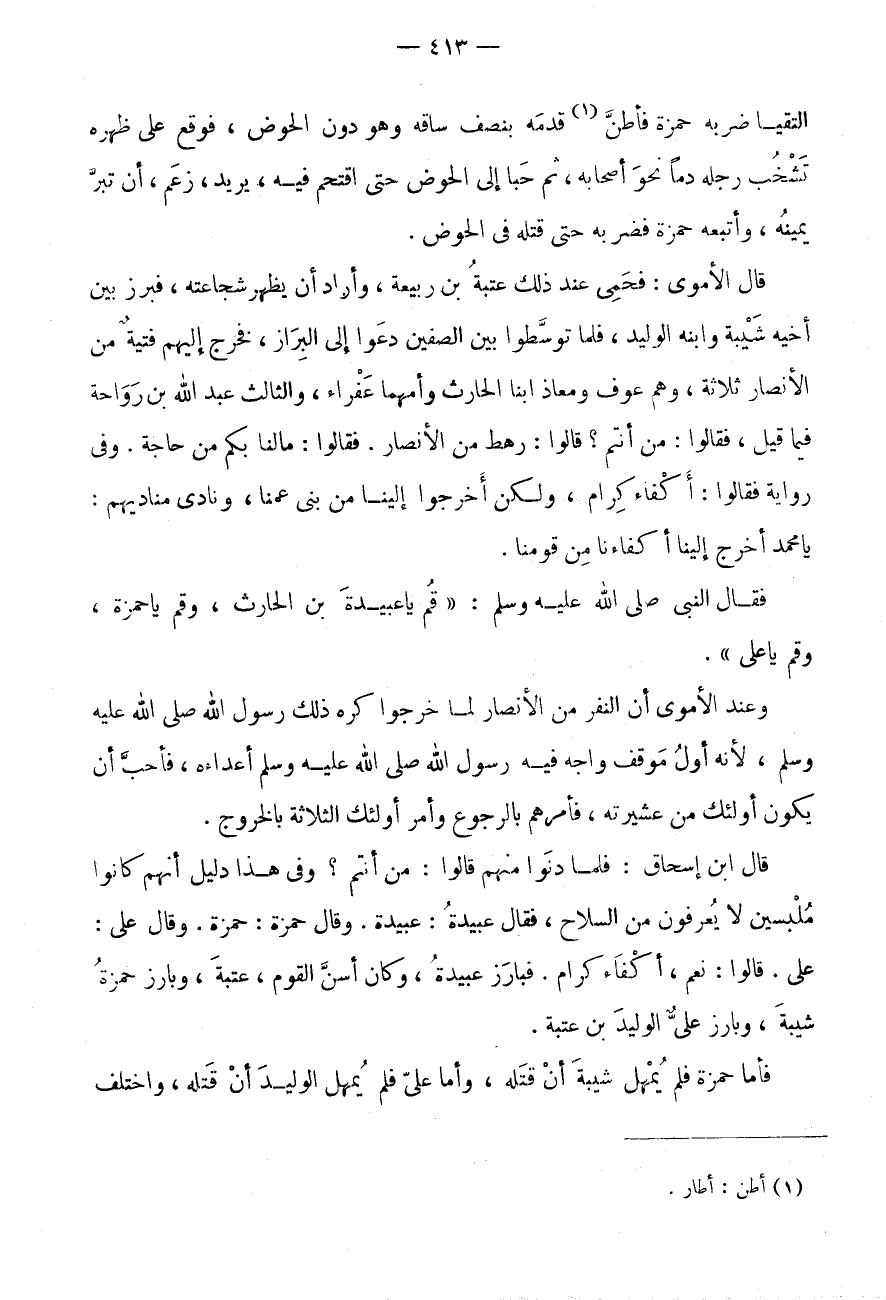 الْتَقَيَا ضَرَبَهُ حَمْزَةُ فَأَطَنَّ (1) قَدَمَهُ بِنِصْفِ سَاقِهِ وَهُوَ دُونَ الْحَوْضِ، فَوَقَعَ عَلَى ظَهْرِهِ تَشْخُبُ رِجْلُهُ دَمًا نَحْوَ أَصْحَابِهِ، ثُمَّ حَبَا إِلَى الْحَوْضِ حَتَّى اقْتَحَمَ فِيهِ، يُرِيدُ، زَعَمَ، أَنْ تبر يَمِينَهُ، وَاتَّبَعَهُ حَمْزَةُ فَضَرَبَهُ حَتَّى قَتَلَهُ فِي الْحَوْضِ.