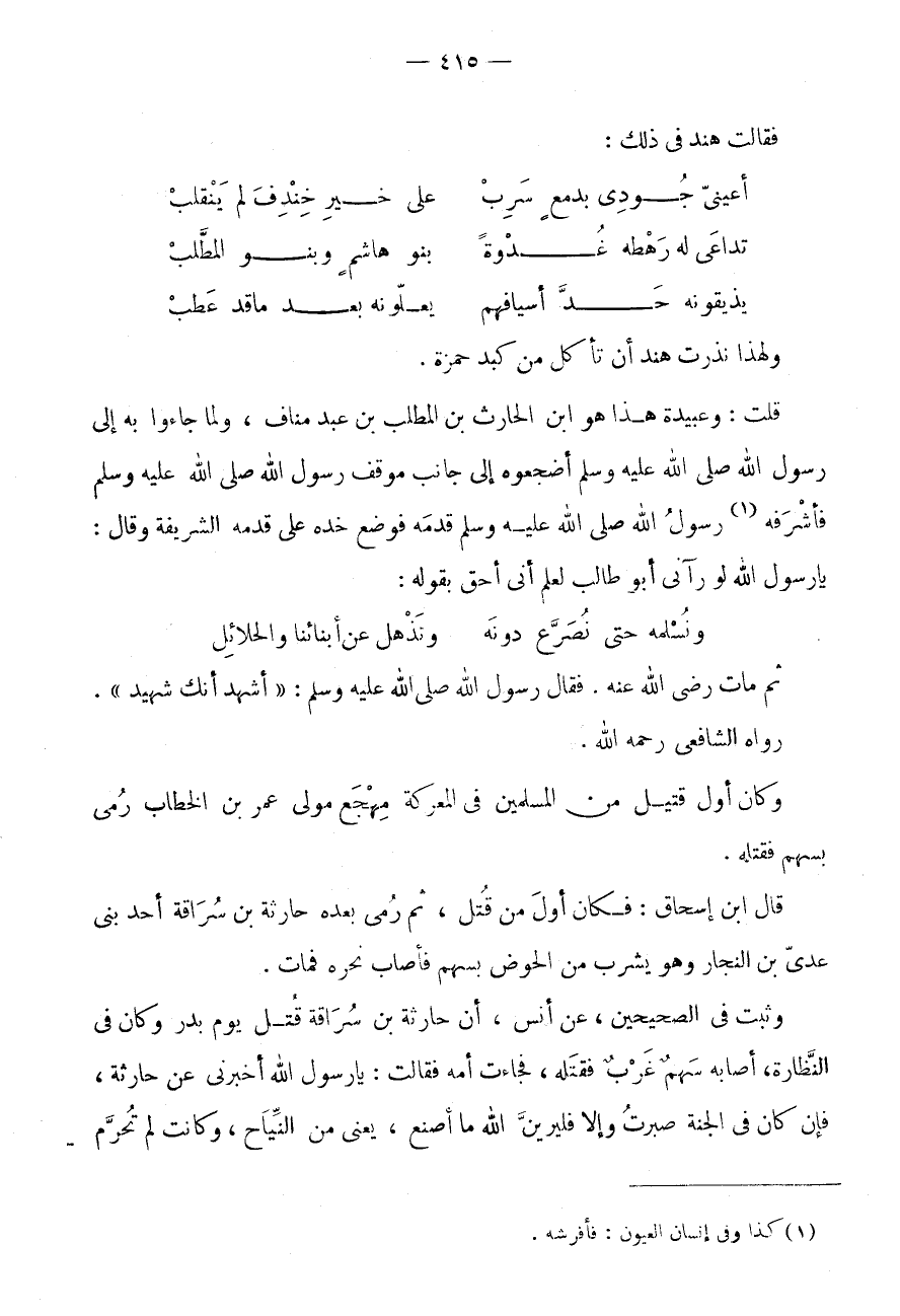 فَقَالَت هِنْد فِي ذَلِك: أعيني جودى بِدَمْعٍ سَرِبْ * عَلَى خَيْرِ خِنْدِفَ لَمْ يَنْقَلِبْ تَدَاعَى لَهُ رَهْطُهُ غُدْوَةً * بَنُو هَاشِمٍ وَبَنُو الْمُطَّلِبْ يُذِيقُونَهُ حَدَّ أَسْيَافِهِمْ * يَعُلُّونَهُ بَعْدَ مَا قَدْ عَطِبَ وَلِهَذَا نَذَرَتْ هِنْدُ أَنْ تَأْكُلَ مِنْ كَبِدِ حَمْزَةَ.