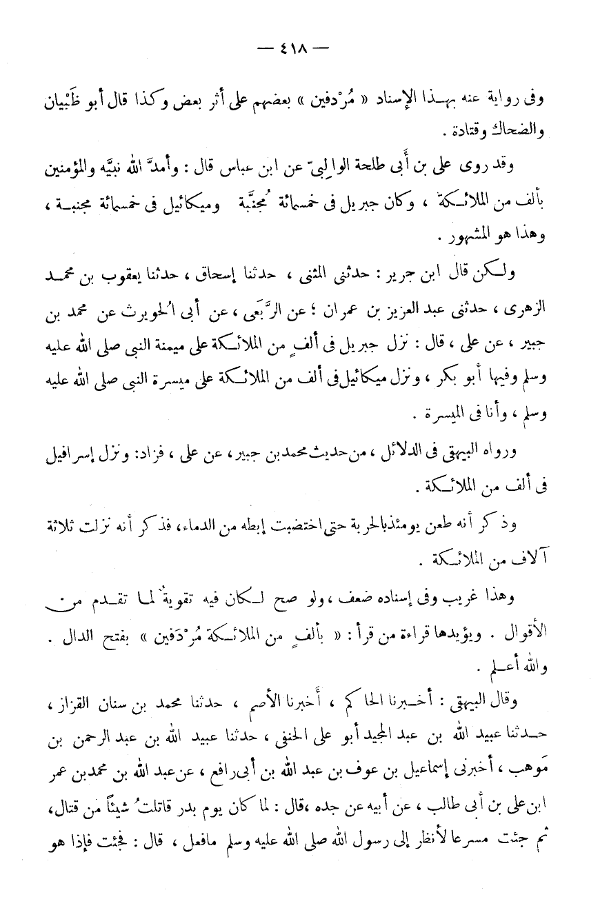 وَلَكِنْ قَالَ ابْنُ جرير: حَدَّثَنى الْمثنى، حَدثنَا إِسْحَاق، حَدثنَا يَعْقُوبُ بْنُ مُحَمَّدٍ الزُّهْرِيُّ، حَدَّثَنِي عَبْدُ الْعُزَيْزِ بن عمرَان، عَن الربعِي، عَنْ أَبِي الْحُوَيْرِثِ عَنْ مُحَمَّدِ بْنِ جُبَيْرٍ، عَنْ عَلِيٍّ، قَالَ: نَزَلَ جِبْرِيلُ فِي أَلْفٍ من الْمَلَائِكَة على مَيْمَنَةِ النَّبِيِّ صَلَّى اللَّهُ عَلَيْهِ وَسَلَّمَ وَفِيهَا أَبُو بَكْرٍ، وَنَزَلَ مِيكَائِيلُ فِي أَلْفٍ مِنَ الْمَلَائِكَة على مَيْسَرَةِ النَّبِيِّ صَلَّى اللَّهُ عَلَيْهِ وَسَلَّمَ، وَأَنَا فِي الْمَيْسَرَةِ.