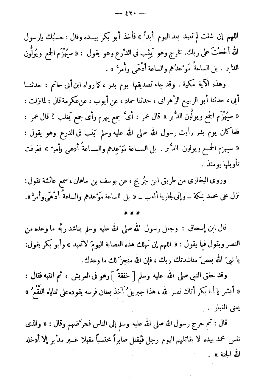 اللَّهُمَّ إِنْ شِئْتَ لَمْ تُعْبَدْ بَعْدَ الْيَوْمِ أَبَدًا " فَأَخَذَ أَبُو بَكْرٍ بِيَدِهِ وَقَالَ: حَسْبُكَ يَا رَسُولَ اللَّهِ أَلْحَحْتَ عَلَى رَبِّكَ.