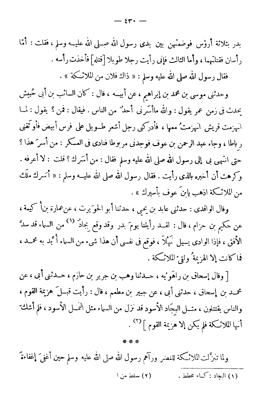 مُحَمَّدِ بْنِ إِسْحَاقَ، حَدَّثَنِي أَبِي، عَنْ جُبَيْرِ بْنِ مُطْعِمٍ، قَالَ: رَأَيْتُ قَبْلَ هَزِيمَةِ الْقَوْمِ، وَالنَّاسُ يَقْتَتِلُونَ، مِثْلَ الْبِجَادِ الْأَسْوَدِ قَدْ نَزَلَ مِنَ السَّمَاءِ مِثْلَ النَّمْلِ الْأَسْوَدِ، فَلَمْ أَشُكَّ أَنَّهَا الْمَلَائِكَةُ فَلَمْ يَكُنْ إِلَّا هَزِيمَةُ الْقَوْمِ] (2) .