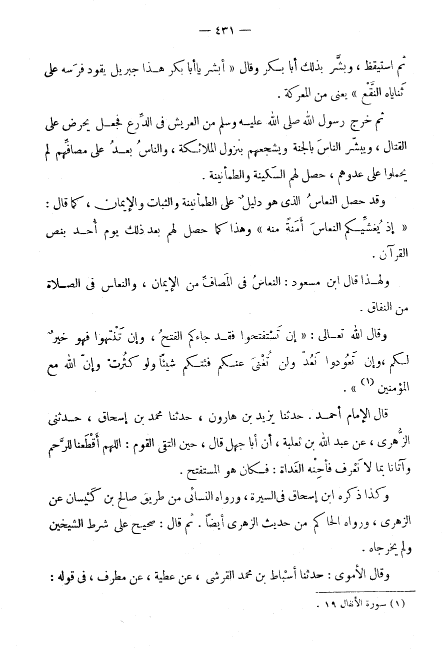 وَقَالَ اللَّهُ تَعَالَى: " إِنْ تَسْتَفْتِحُوا فَقَدْ جَاءَكُمُ الْفَتْحُ، وَإِنْ تَنْتَهُوا فَهُوَ خَيْرٌ لَكُمْ، وَإِنْ تَعُودُوا نَعُدْ وَلَنْ تُغْنِيَ عَنْكُمْ فِئَتُكُمْ شَيْئًا وَلَوْ كَثُرَتْ وَأَنَّ اللَّهَ مَعَ الْمُؤمنِينَ (1) ".