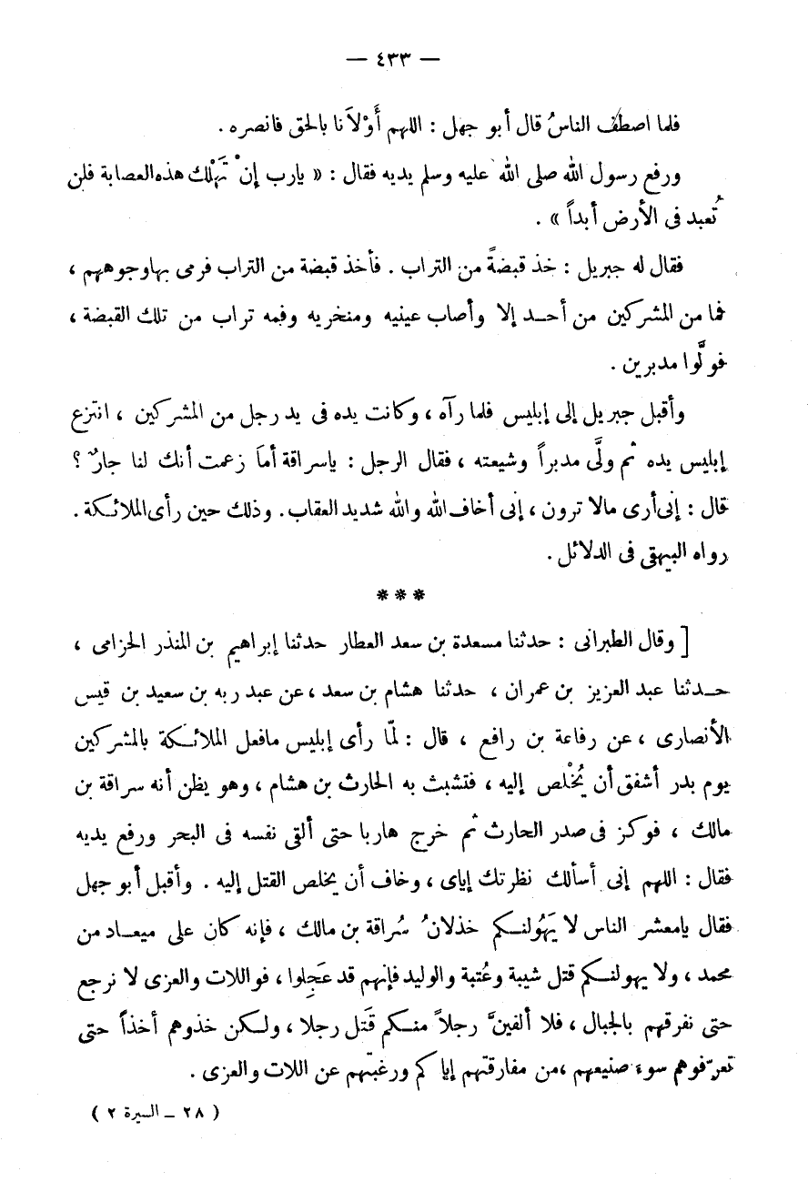 وَأَقْبَلَ جِبْرِيلُ إِلَى إِبْلِيسَ فَلَمَّا رَآهُ، وَكَانَتْ يَدُهُ فِي يَدِ رَجُلٍ مِنَ الْمُشْرِكِينَ، انْتَزَعَ إِبْلِيسُ يَدَهُ ثُمَّ وَلَّى مُدْبِرًا وَشِيعَتُهُ، فَقَالَ الرَّجُلُ: يَا سُرَاقَةُ أَمَا زَعَمْتَ أَنَّكَ لَنَا جَارٌ؟ قَالَ: إِنِّي أَرَى مَا لَا تَرَوْنَ، إِنِّي أَخَافُ اللَّهَ وَالله شَدِيد الْعقَاب.