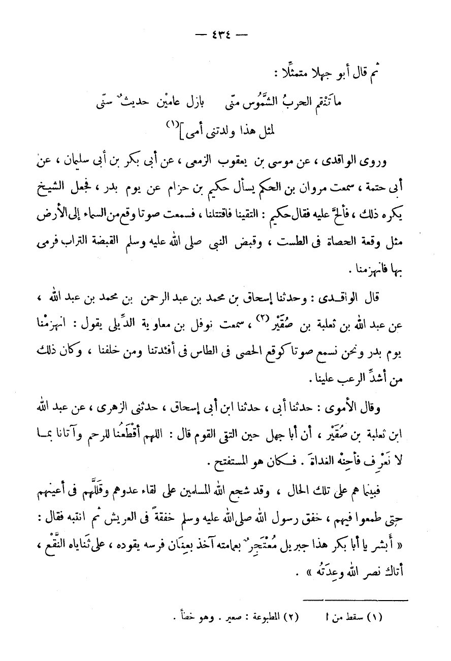 ثمَّ قَالَ أَبُو جهلا مُتَمَثِّلًا: مَا تَنْقِمُ الْحَرْبُ الشَّمُوسُ مِنِّي * بَازِلُ عَامَيْنِ حَدِيثٌ سِنِّي لِمِثْلِ هَذَا وَلَدَتْنِي أُمِّي] (1) وَرَوَى الْوَاقِدِيُّ، عَنْ مُوسَى بْنِ يَعْقُوبَ الزَّمْعِيِّ، عَنْ أَبِي بَكْرِ بْنِ أَبِي سُلَيْمَانَ، عَنْ أَبى حتمة، سَمِعْتُ مَرْوَانَ بْنَ الْحَكَمِ يَسْأَلُ حَكِيمَ بْنَ حِزَامٍ عَنْ يَوْمِ بَدْرٍ، فَجَعَلَ الشَّيْخُ يَكْرَهُ ذَلِكَ، فَأَلَحَّ عَلَيْهِ فَقَالَ حَكِيمٌ: الْتَقَيْنَا فَاقْتَتَلْنَا، فَسَمِعْتُ صَوْتًا وَقَعَ مِنَ السَّمَاءِ إِلَى الْأَرْضِ مِثْلَ وَقْعَةِ الْحَصَاةِ فِي الطَّسْتِ، وَقَبَضَ النَّبِيُّ صَلَّى اللَّهُ عَلَيْهِ وَسَلَّمَ الْقَبْضَةَ التُّرَابَ فَرَمَى بِهَا فَانْهَزَمْنَا.