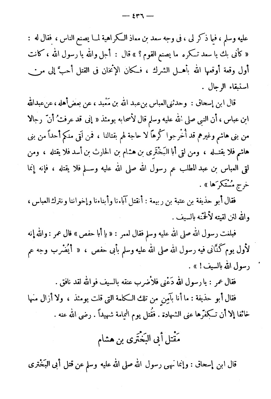 مَقْتَلُ أَبِي الْبَخْتَرِيِّ بْنِ هِشَامٍ قَالَ ابْنُ إِسْحَاقَ: وَإِنَّمَا نَهَى رَسُولُ اللَّهِ صَلَّى اللَّهُ عَلَيْهِ وَسَلَّمَ عَنْ قَتْلِ أَبِي البخترى