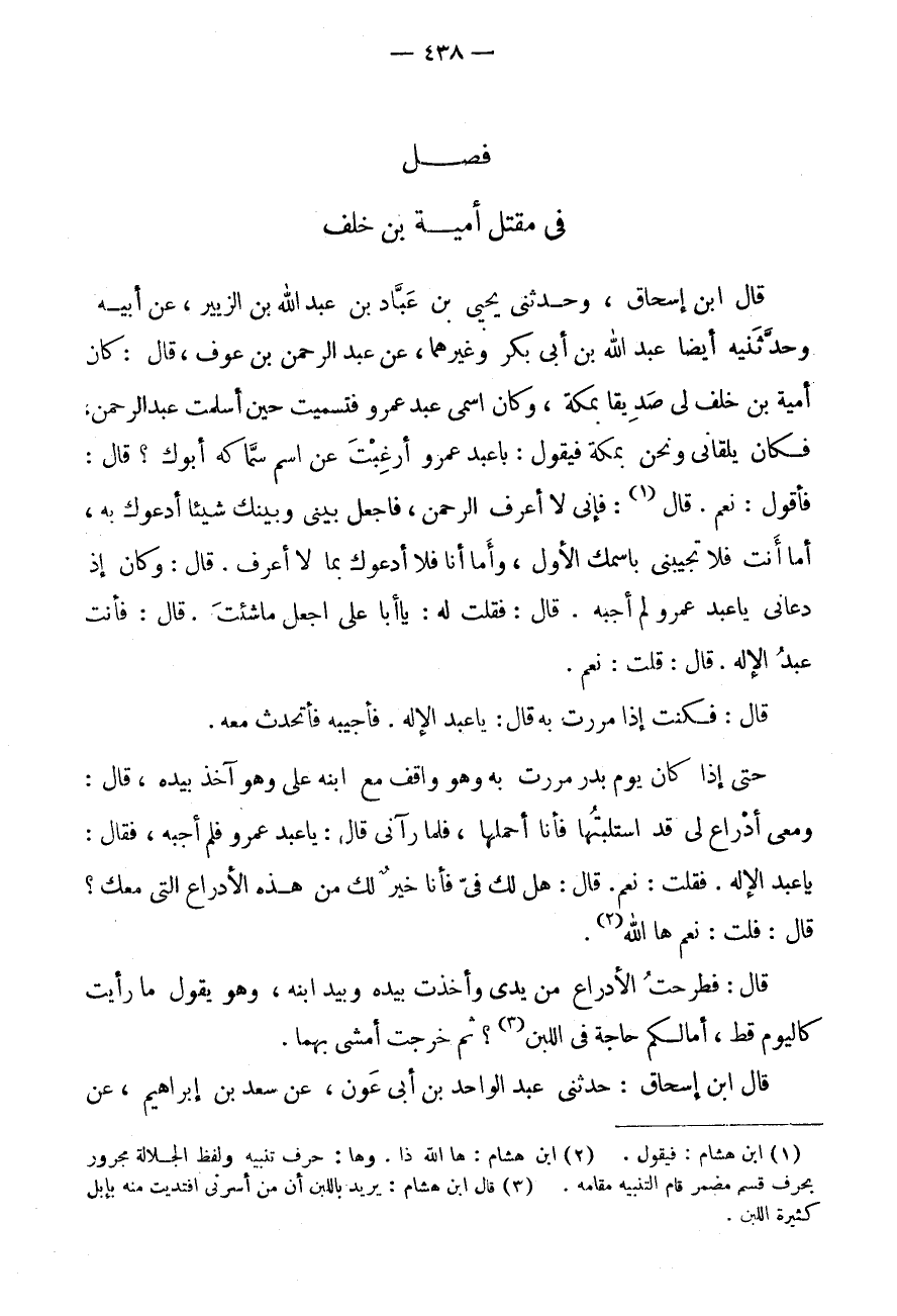 فَصْلٌ فِي مَقْتَلِ أُمَيَّةَ بْنِ خَلَفٍ قَالَ ابْنُ إِسْحَاقَ: وَحَدَّثَنِي يَحْيَى بْنُ عَبَّادِ بْنِ عَبْدِ اللَّهِ بْنِ الزُّبَيْرِ، عَنْ أَبِيهِ وَحَدَّثَنِيهِ أَيْضًا عَبْدُ اللَّهِ بْنُ أَبِي بَكْرٍ وَغَيْرُهُمَا، عَنْ عَبْدِ الرَّحْمَنِ بْنِ عَوْفٍ، قَالَ: كَانَ أُمَيَّةُ بْنُ خَلَفٍ لِي صَدِيقًا بِمَكَّةَ، وَكَانَ اسْمِي عَبْدَ عَمْرٍو فَتَسَمَّيْتُ حِينَ أَسْلَمْتُ عَبْدَ الرَّحْمَن، فَكَانَ يلقانى وَنحن بِمَكَّةَ فَيَقُولُ: يَا عَبْدَ عَمْرٍو أَرَغِبْتَ عَنِ اسْم سماكه أَبوك؟ قَالَ: فَأَقُولُ: نَعَمْ.