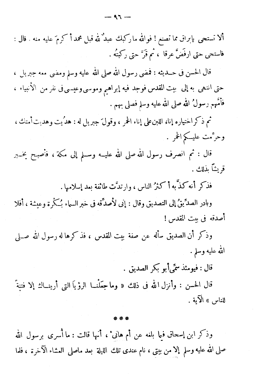 * * * وَذَكَرَ ابْنُ إِسْحَاقَ فِيمَا بَلَغَهُ عَنْ أُمِّ هَانِئٍ، أَنَّهَا قَالَتْ: مَا أُسْرِيَ بِرَسُولِ اللَّهِ صَلَّى اللَّهُ عَلَيْهِ وَسَلَّمَ إِلَّا مِنْ بَيْتِي، نَامَ عِنْدِي تِلْكَ اللَّيْلَةَ بَعْدَ مَا صَلَّى الْعِشَاءَ الْآخِرَةَ، فَلَمَّا