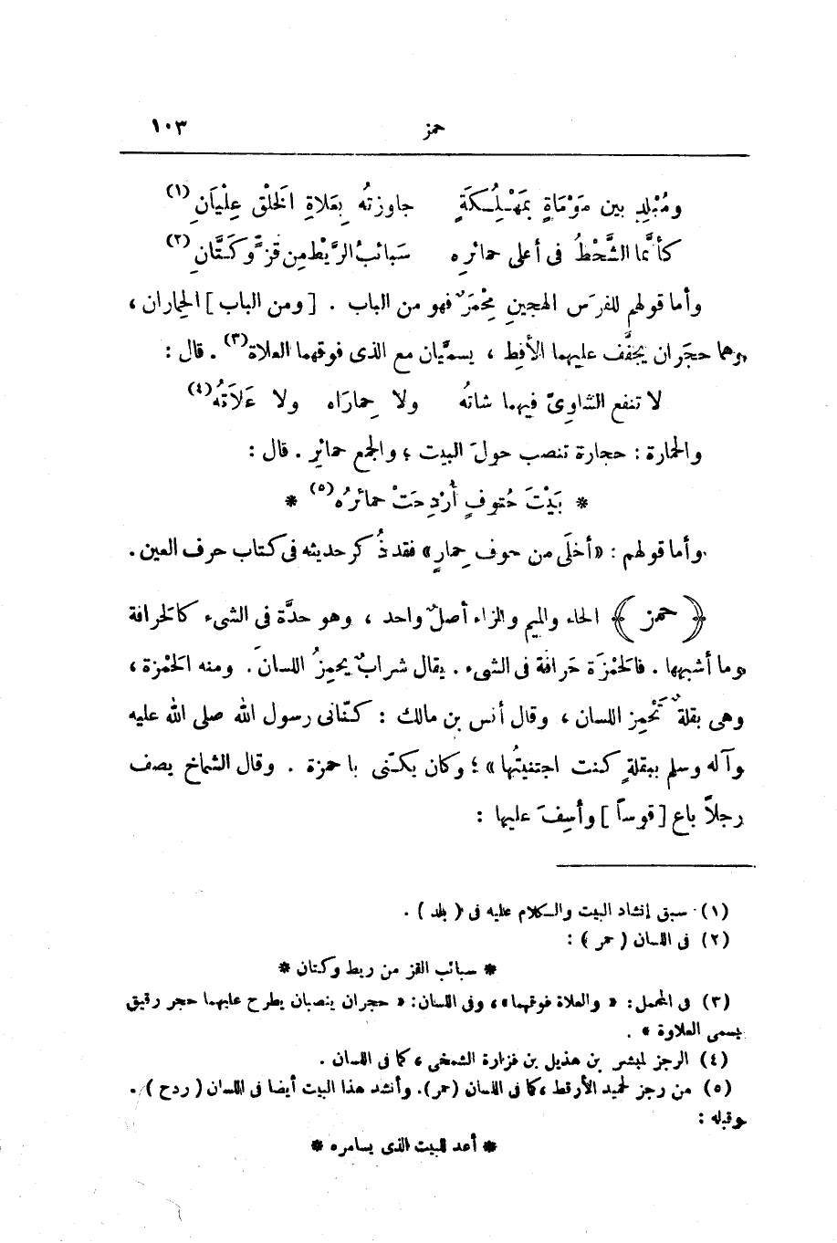 وَالْحَمَّارَةُ: حِجَارَةٌ تُنْصَبُ حَوْلَ الْبَيْتِ، وَالْجَمْعُ حَمَائِرُ. قَالَ: