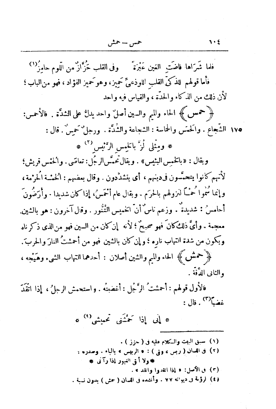 وَيُقَالُ: " بِالْحَمِسِ الْبَئِيسِ ". وَيُقَالُ تَحَمَّسَ الرَّجُلُ: تَعَاصَى. وَالْحُمْسُ قُرَيْشٌ ; لِأَنَّهُمْ كَانُوا يَتَحَمَّسُونَ فِي دِينِهِمْ، أَيْ يَتَشَدَّدُونَ. وَقَالَ بَعْضُهُمُ: الْحُمْسَةُ الْحُرْمَةُ، وَإِنَّمَا سُمُّوا حُمْسًا لِنُزُولِهِمْ بِالْحَرَمِ. وَيُقَالُ عَامٌ أَحْمَسُ، إِذَا كَانَ شَدِيدًا. وَأَرَضُونَ أَحَامِسُ: شَدِيدَةٌ. وَزَعَمَ نَاسٌ أَنَّ الْحَمِيسَ التَّنُّورُ. وَقَالَ آخَرُونَ: هُوَ بِالشِّينِ مُعْجَمَةً. وَأَيَّ ذَلِكَ كَانَ فَهُوَ صَحِيحٌ ; لِأَنَّهُ إِنْ كَانَ مِنَ السِّينِ فَهُوَ مِنَ الَّذِي ذَكَرْنَاهُ وَيَكُونُ مِنْ شِدَّةِ الْتِهَابِ نَارِهِ ; وَإِنْ كَانَ بِالشِّينِ فَهُوَ مِنْ أَحْمَشْتُ النَّارَ وَالْحَرْبَ.
