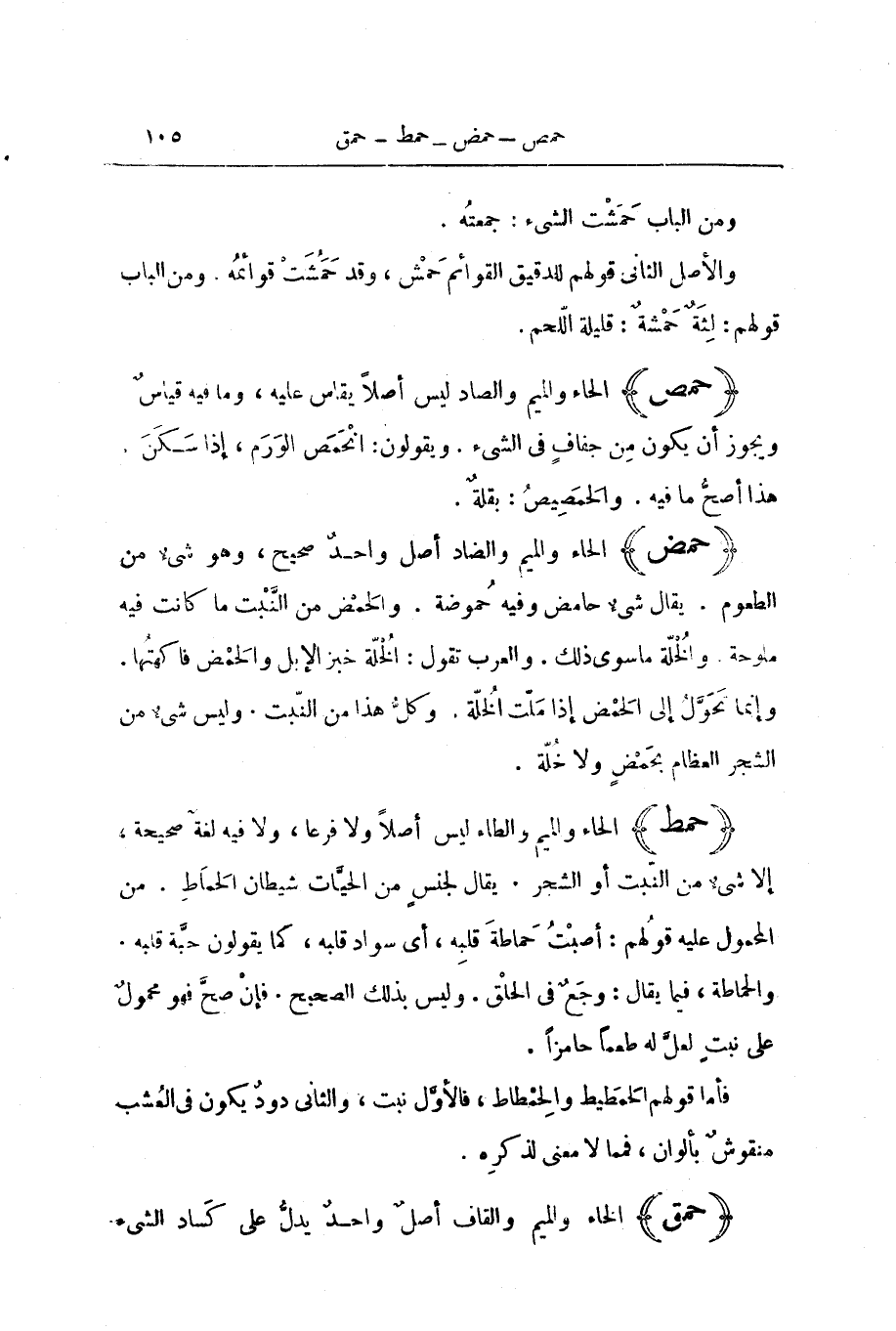 فَأَمَّا قَوْلُهُمُ الْحَمَطِيطُ وَالْحِمْطَاطُ، فَالْأَوَّلُ نَبْتٌ، وَالثَّانِي دُودٌ يَكُونُ فِي الْعُشْبِ مَنْقُوشٌ بِأَلْوَانٍ، فَمِمَّا لَا مَعْنَى لِذِكْرِهِ.