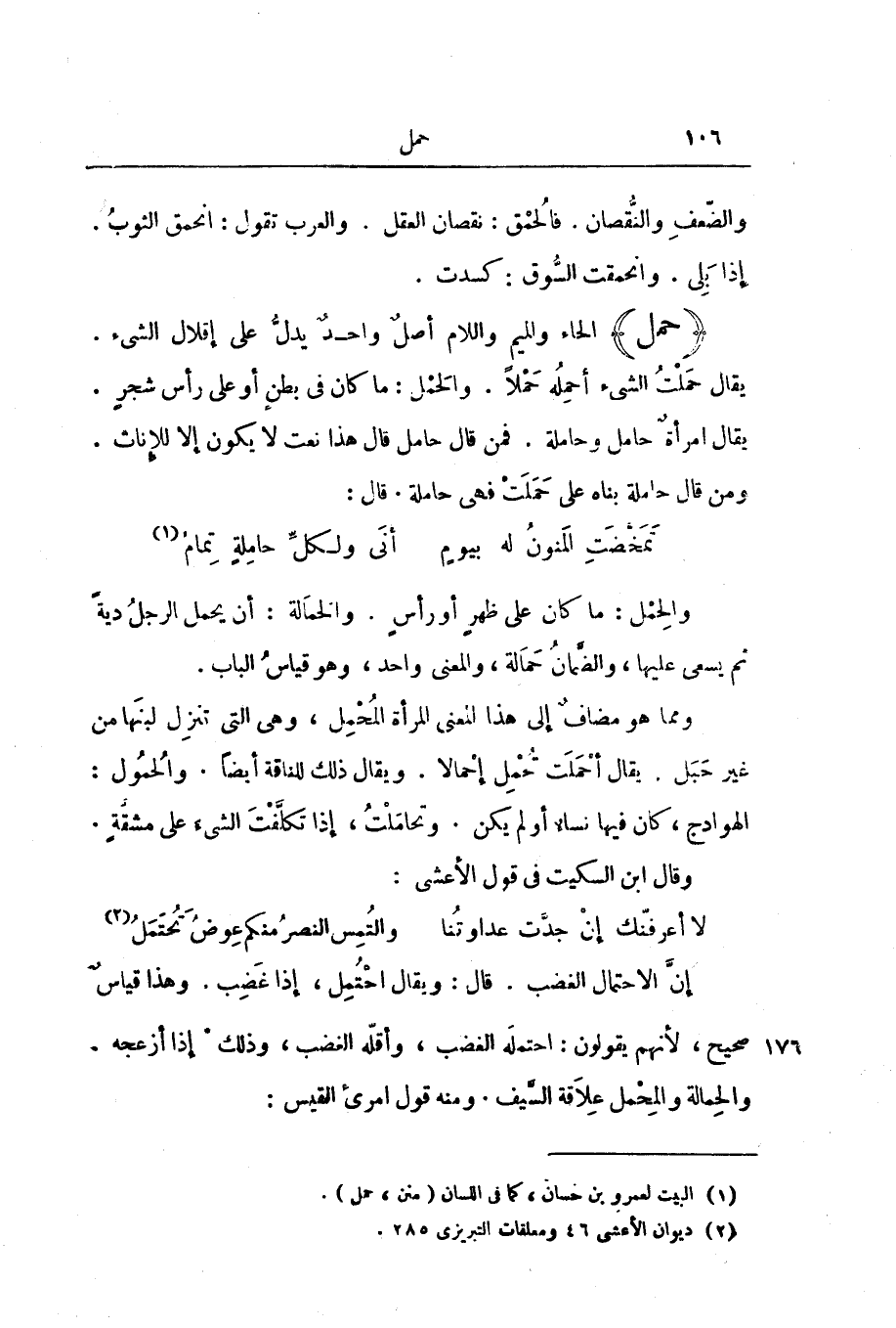 (حَمَلَ) الْحَاءُ وَالْمِيمُ وَاللَّامُ أَصْلٌ وَاحِدٌ يَدُلُّ عَلَى إِقْلَالِ الشَّيْءِ. يُقَالُ حَمَلْتُ الشَّيْءَ أَحْمِلُهُ حَمْلًا. وَالْحَمْلُ: مَا كَانَ فِي بَطْنٍ أَوْ عَلَى رَأْسِ شَجَرٍ. يُقَالُ امْرَأَةٌ حَامِلٌ وَحَامِلَةٌ. فَمَنْ قَالَ حَامِلٌ قَالَ هَذَا نَعْتٌ لَا يَكُونُ إِلَّا لِلْإِنَاثِ. وَمَنْ قَالَ حَامِلَةٌ بَنَاهُ عَلَى حَمَلَتْ فَهِيَ حَامِلَةٌ. قَالَ: