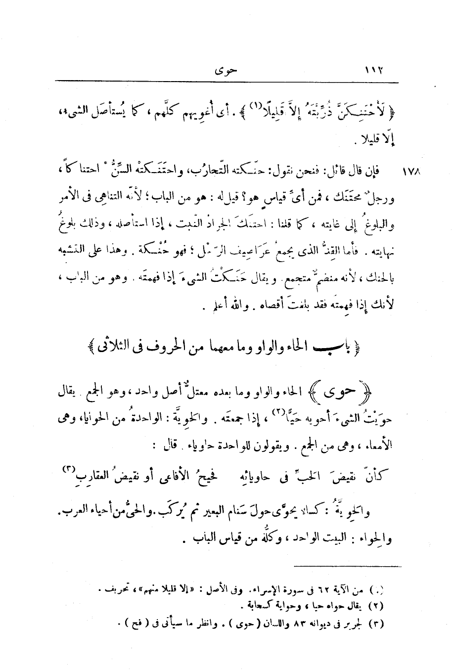 {لَأَحْتَنِكَنَّ ذُرِّيَّتَهُ إِلَّا قَلِيلًا} [الإسراء: 62] . أَيْ أُغْوِيهِمْ كُلَّهُمْ، كَمَا يُسْتَأْصَلُ الشَّيْءُ، إِلَّا قَلِيلًا.