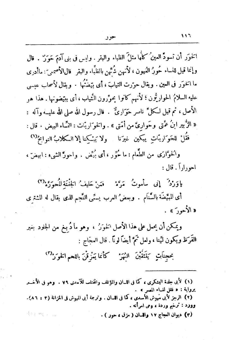 الْحَوَرُ أَنْ تَسْوَدَّ الْعَيْنُ كُلُّهَا مِثْلُ الظِّبَاءِ وَالْبَقَرِ. وَلَيْسَ فِي بَنِي آدَمَ حَوَرٌ. قَالَ وَإِنَّمَا قِيلَ لِلنِّسَاءِ حُورُ الْعُيُونِ، لِأَنَّهُنَّ شُبِّهْنَ بِالظِّبَاءِ وَالْبَقَرِ قَالَ الْأَصْمَعِيُّ: مَا أَدْرِي مَا الْحَوَرُ فِي الْعَيْنِ. وَيُقَالُ حَوَّرَتِ الثِّيَابَ، أَيْ بَيَّضْتُهَا، وَيُقَالُ لِأَصْحَابِ عِيسَى عَلَيْهِ السَّلَامُ الْحَوَارِيُّونَ ; لِأَنَّهُمْ كَانُوا يُحَوِّرُونَ الثِّيَابَ، أَيْ يُبَيِّضُونَهَا. هَذَا هُوَ الْأَصْلُ، ثُمَّ قِيلَ لِكُلِّ نَاصِرٍ حَوَارِيٌّ. قَالَ رَسُولُ اللَّهِ صَلَّى اللَّهُ عَلَيْهِ وَآلِهِ: " «الزُّبَيْرُ ابْنُ عَمَّتِي وَحَوَارِيِّي مِنْ أُمَّتِي» ". وَالْحَوَارِيَّاتُ: النِّسَاءُ الْبَيْضُ. قَالَ: