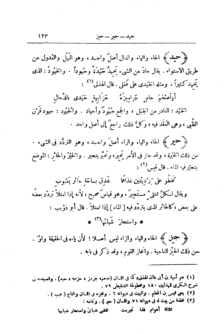 الْحَيْدُ: النَّادِرُ مِنَ الْجَبَلِ، وَالْجَمْعِ حُيُودٌ وَأَحْيَادٌ. وَالْحُيُودُ: حُيُودُ قَرْنِ الظَّبْيِ، وَهِيَ الْعُقَدُ فِيهِ، وَكُلُّ ذَلِكَ رَاجِعٌ إِلَى أَصْلٍ وَاحِدٍ.