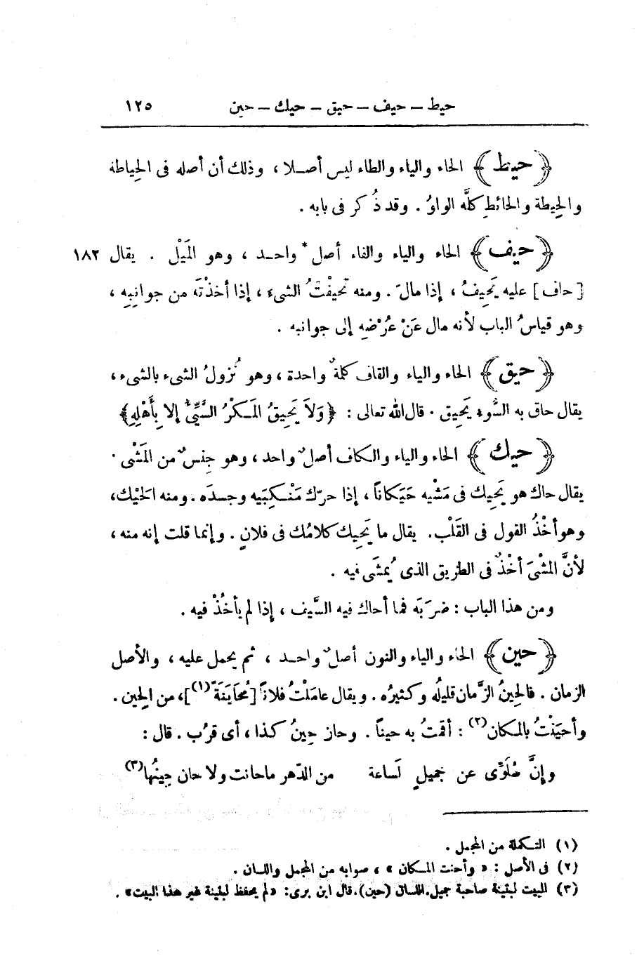 (حَيَنَ) الْحَاءُ وَالْيَاءُ وَالنُّونُ أَصْلٌ وَاحِدٌ، ثُمَّ يُحْمَلُ عَلَيْهِ، وَالْأَصْلُ الزَّمَانُ. فَالْحِينُ الزَّمَانُ قَلِيلُهُ وَكَثِيرُهُ. وَيُقَالُ عَامَلْتُ فُلَانًا [مُحَايَنَةً] ، مِنَ الْحِينِ. وَأَحْيَنْتُ بِالْمَكَانِ: أَقَمْتُ بِهِ حِينًا. وَحَازَ حِينَ كَذَا، أَيْ قَرُبَ. قَالَ: