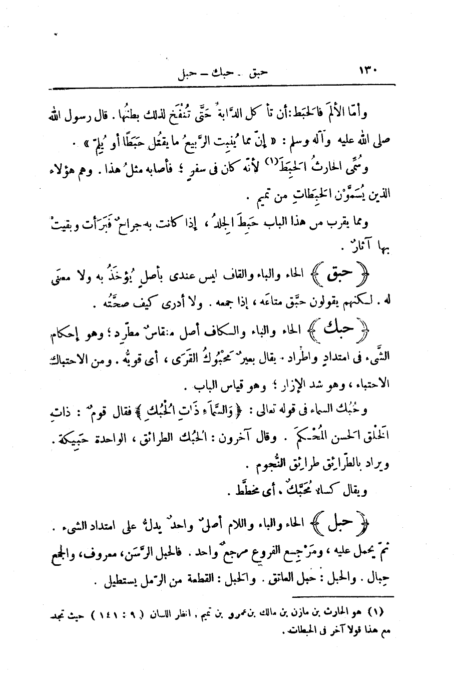 (حَبَكَ) الْحَاءُ وَالْبَاءُ وَالْكَافُ أَصْلٌ مُنْقَاسٌ مُطَّرِدٌ ; وَهُوَ إِحْكَامُ الشَّيْءِ فِي امْتِدَادٍ وَاطِّرَادٍ. يُقَالُ بَعِيرٌ مَحْبُوكُ الْقَرَى، أَيْ قَوِيُّهُ. وَمِنَ الِاحْتِبَاكِ الِاحْتِبَاءُ، وَهُوَ شَدُّ الْإِزَارِ ; وَهُوَ قِيَاسُ الْبَابِ.