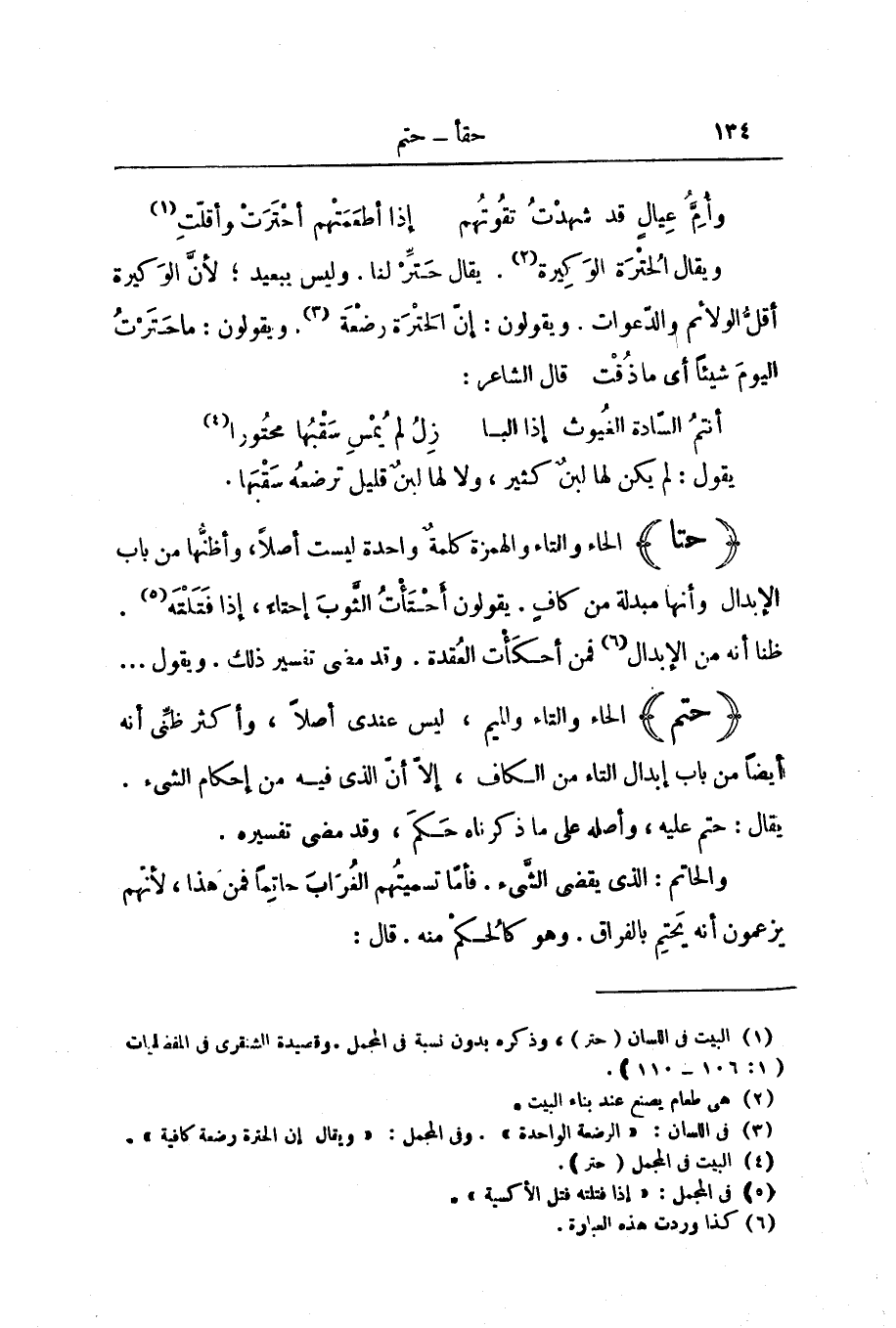 (حَتَمَ) الْحَاءُ وَالتَّاءُ وَالْمِيمُ، لَيْسَ عِنْدِي أَصْلًا، وَأَكْثَرُ ظَنِّي أَنَّهُ أَيْضًا مِنْ بَابِ إِبْدَالِ التَّاءِ مِنَ الْكَافِ، إِلَّا أَنَّ الَّذِي فِيهِ مِنْ إِحْكَامِ الشَّيْءِ. يُقَالُ: حَتَّمَ عَلَيْهِ، وَأَصْلُهُ عَلَى مَا ذَكَرْنَاهُ حَكَمَ، وَقَدْ مَضَى تَفْسِيرُهُ.