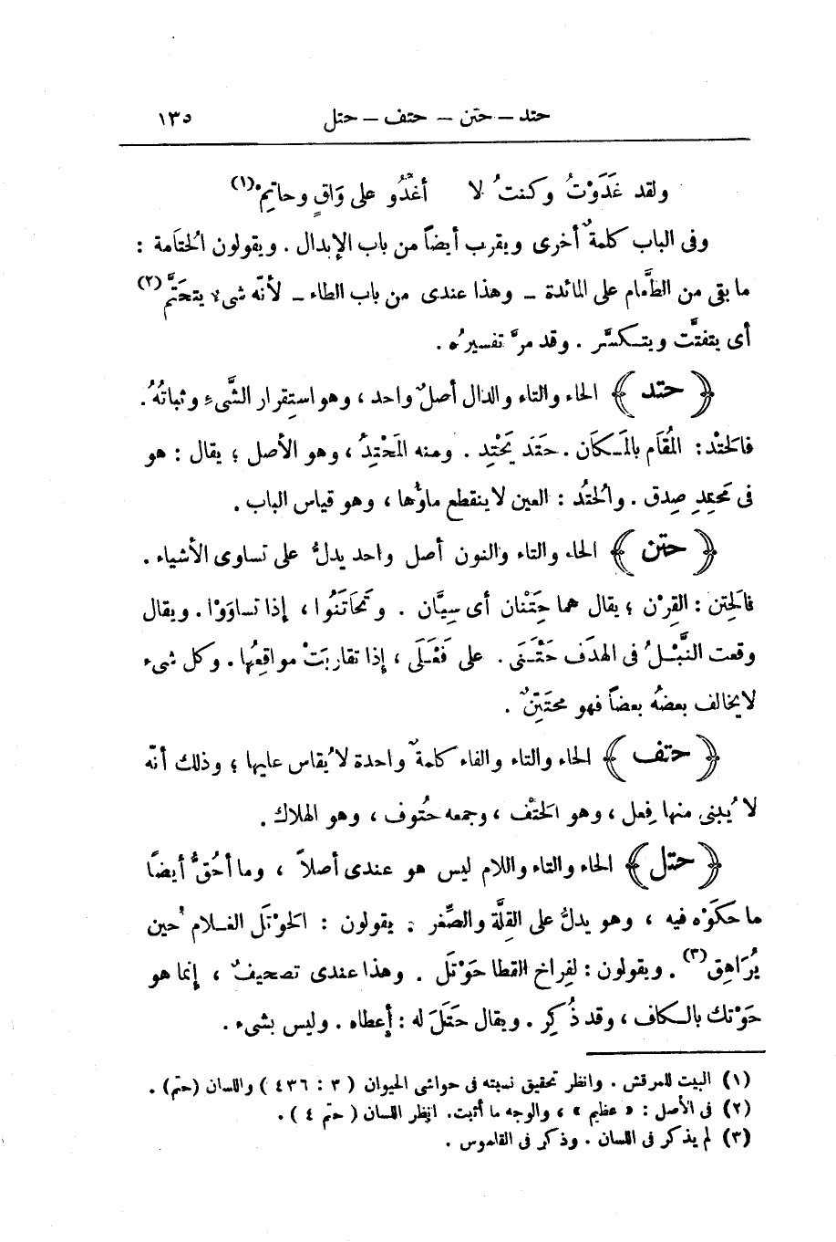 (حَتَلَ) الْحَاءُ وَالتَّاءُ وَاللَّامُ لَيْسَ هُوَ عِنْدِي أَصْلًا، وَمَا أَحُقٌ أَيْضًا مَا حَكَوْهُ فِيهِ، وَهُوَ يَدُلُّ عَلَى الْقِلَّةِ وَالصِّغَرِ. يَقُولُونَ: الْحَوْتَلُ الْغُلَامُ حِينَ يُرَاهِقُ. وَيَقُولُونَ: لِفِرَاخِ الْقِطَا حَوْتَلٌ. وَهَذَا عِنْدِي تَصْحِيفٌ، إِنَّمَا هُوَ حَوْتَكٌ بِالْكَافِ، وَقَدْ ذُكِرَ. وَيُقَالُ حَتَلَ لَهُ: أَعْطَاهُ. وَلَيْسَ بِشَيْءٍ.