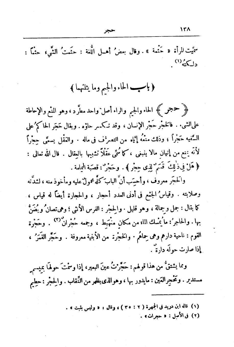 وَالْحَجَرُ مَعْرُوفٌ، وَأَحْسِبُ أَنَّ الْبَابَ كُلَّهُ مَحْمُولٌ عَلَيْهِ وَمَأْخُوذٌ مِنْهُ، لِشِدَّتِهِ وَصَلَابَتِهِ. وَقِيَاسُ الْجَمْعِ فِي أَدْنَى الْعَدَدِ أَحْجَارٌ، وَالْحِجَارَةُ أَيْضًا لَهُ قِيَاسٌ، كَمَا يُقَالُ: جَمَلٌ وَجِمَالَةٌ، وَهُوَ قَلِيلٌ. وَالْحِجْرُ: الْفَرَسُ الْأُنْثَى ; وَهِيَ تُصَانُ وَيُضَنُّ بِهَا. وَالْحَاجِرُ: مَا يُمْسِكُ الْمَاءَ مِنْ مَكَانٍ مُنْهَبِطٍ، وَجَمْعُهُ حُجْرَانٌ. وَحَجْرَةُ الْقَوْمِ: نَاحِيَةُ دَارِهِمْ وَهِيَ حِمَاهُمْ. وَالْحُجْرَةُ مِنَ الْأَبْنِيَةِ مَعْرُوفَةٌ. وَحَجَّرَ الْقَمَرُ، إِذَا صَارَتْ حَوْلَهُ دَارَةٌ.