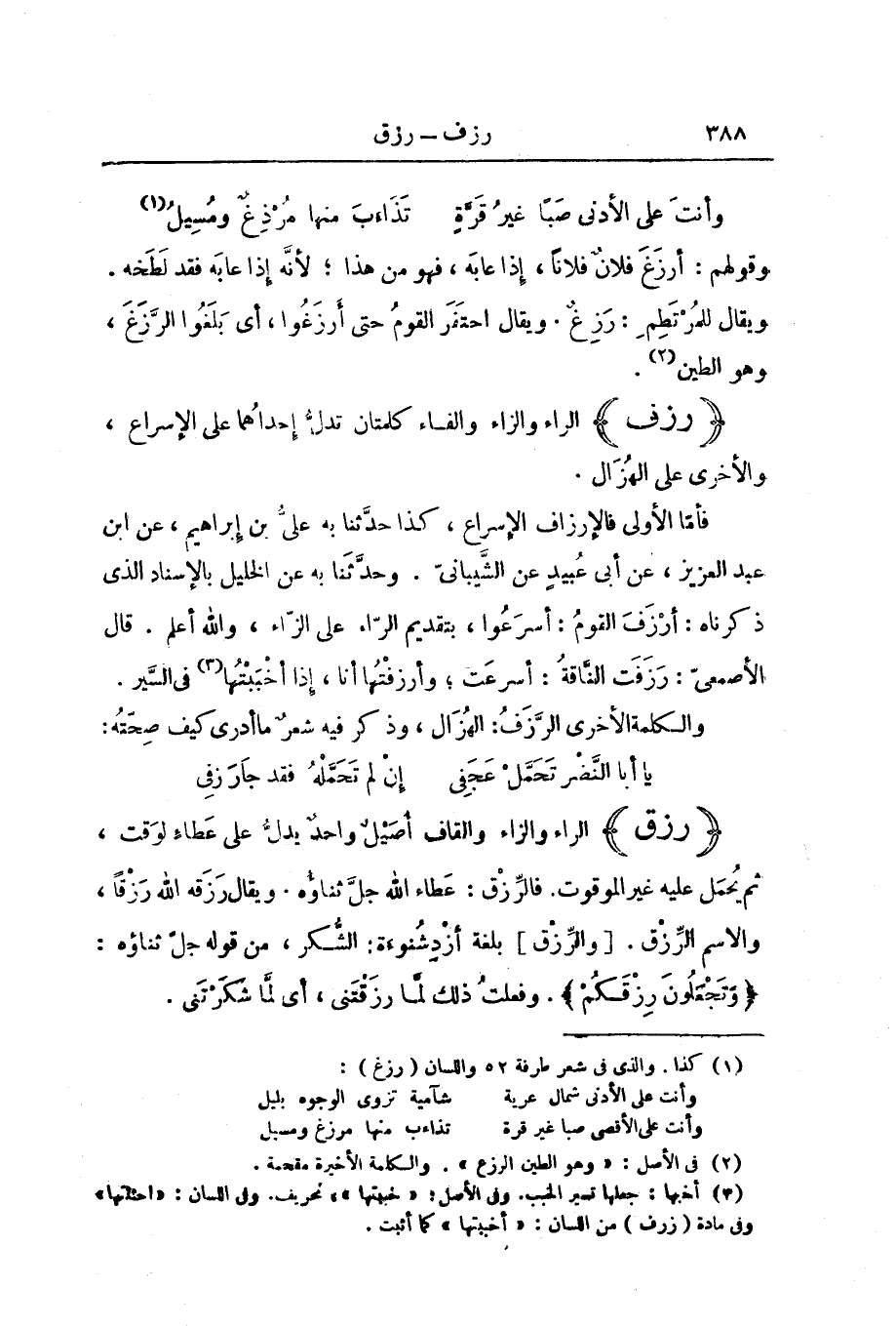 فَأَمَّا الْأُولَى فَالْإِرْزَافُ الْإِسْرَاعُ، كَذَا حَدَّثَنَا بِهِ عَلِيُّ بْنُ إِبْرَاهِيمَ، عَنِ ابْنِ عَبْدِ الْعَزِيزِ، عَنْ أَبِي عُبَيْدٍ، عَنِ الشَّيْبَانِيِّ. وَحَدَّثَنَا بِهِ عَنِ الْخَلِيلِ بِالْإِسْنَادِ الَّذِي ذَكَرْنَاهُ: أَرْزَفَ الْقَوْمُ: أَسْرَعُوا، بِتَقْدِيمِ الرَّاءِ عَلَى الزَّاءِ، وَاللَّهُ أَعْلَمُ. قَالَ الْأَصْمَعِيُّ: رَزَفَتِ النَّاقَةُ: أَسْرَعَتْ; وَأَرْزَفْتُهَا أَنَا، إِذَا أَخْبَبْتُهَا فِي السَّيْرِ.