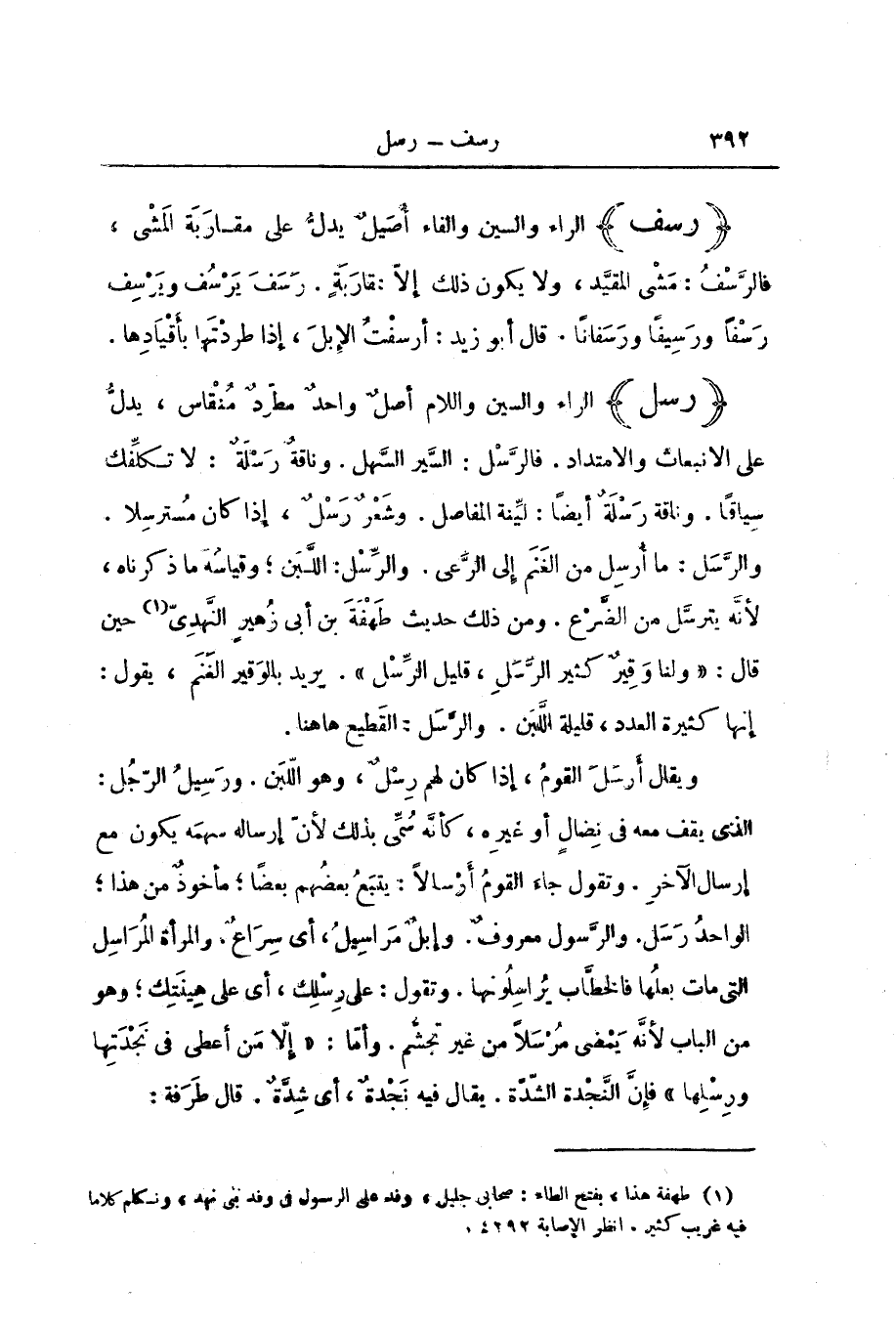 وَالرَّسْلُ: مَا أُرْسِلَ مِنَ الْغَنَمِ إِلَى الرَّعْيِ. وَالرِّسْلُ: اللَّبَنُ; وَقِيَاسُهُ مَا ذَكَرْنَاهُ، لِأَنَّهُ يَتَرَسَّلُ مِنَ الضَّرْعِ. وَمِنْ ذَلِكَ حَدِيثُ طَهْفَةَ بْنِ أَبِي زُهَيْرٍ النَّهْدِيِّ حِينَ قَالَ: " وَلَنَا وَقِيرٌ كَثِيرُ الرَّسَلِ، قَلِيلُ الرِّسْلِ ". يُرِيدُ بِالْوَقِيرِ الْغَنَمَ، يَقُولُ: إِنَّهَا كَثِيرَةُ الْعَدَدِ، قَلِيلَةُ اللَّبَنِ. وَالرَّسَلُ: الْقَطِيعُ هَهُنَا.