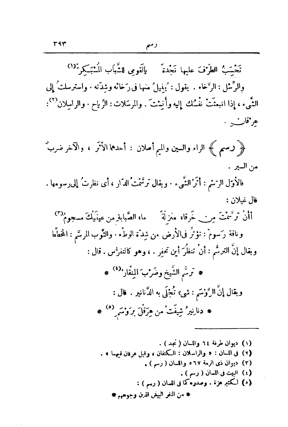 فَالْأَوَّلُ الرَّسْمُ: أَثَرُ الشَّيْءِ. وَيُقَالُ تَرَسَّمْتُ الدَّارَ، أَيْ نَظَرْتُ إِلَى رُسُومِهَا. قَالَ غَيْلَانُ: