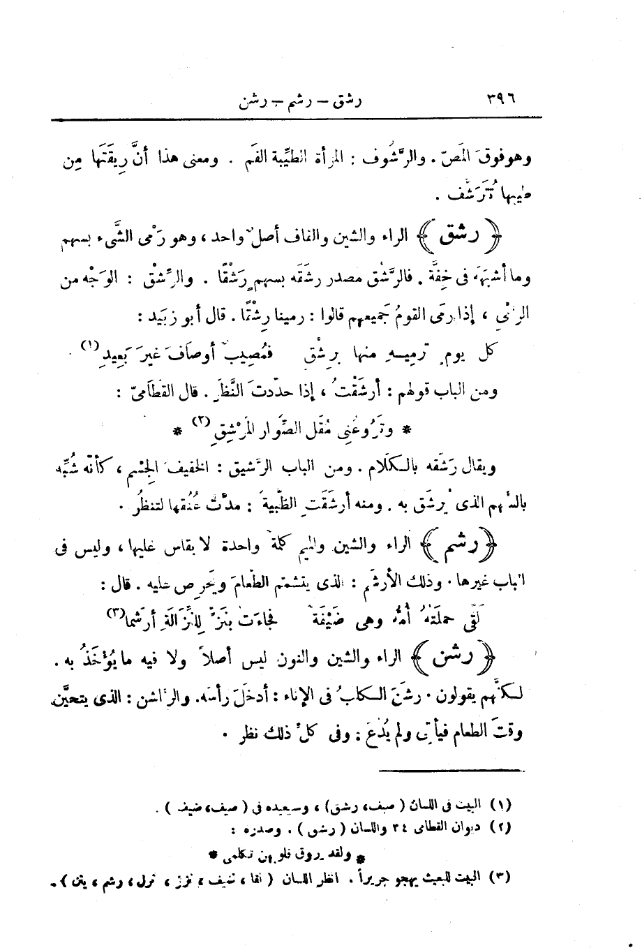 (رَشَنَ) الرَّاءُ وَالشِّينُ وَالنُّونُ لَيْسَ أَصْلًا وَلَا فِيهِ مَا يُؤْخَذُ بِهِ. لَكِنَّهُمْ يَقُولُونَ. رَشَنَ الْكَلْبُ فِي الْإِنَاءِ: أَدْخَلَ رَأْسَهُ. وَالرَّاشِنُ: الَّذِي يَتَحَيَّنُ وَقْتَ الطَّعَامِ فَيَأْتِي وَلَمْ يُدْعَ. وَفِي كُلِّ ذَلِكَ نَظَرٌ.