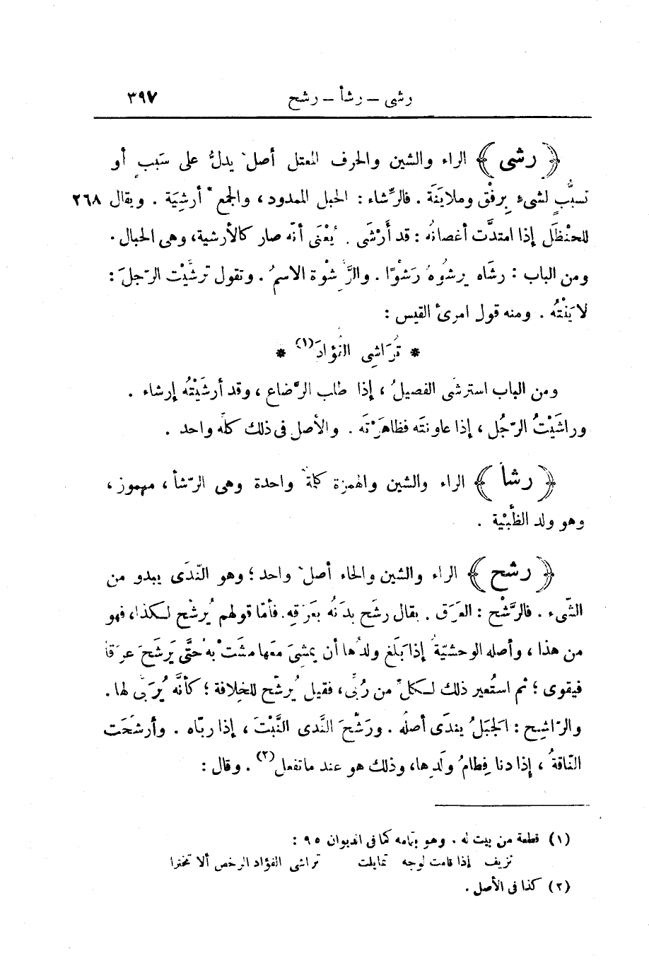 (رَشَى) الرَّاءُ وَالشِّينُ وَالْحَرْفُ الْمُعْتَلُّ أَصْلٌ يَدُلُّ عَلَى سَبَبٍ أَوْ تَسَبُّبٍ لِشَيْءٍ بِرِفْقٍ وَمُلَايَنَةٍ. فَالرِّشَاءُ: الْحَبْلُ الْمَمْدُودُ، وَالْجَمْعُ أَرْشِيَةٌ. وَيُقَالُ لِلْحَنْظَلِ إِذَا امْتَدَّتْ أَغْصَانُهُ: قَدْ أَرْشَى. يُعْنَى أَنَّهُ صَارَ كَالْأَرْشِيَةِ، وَهِيَ الْحِبَالُ. وَمِنَ الْبَابِ: رَشَاهُ يَرْشُوهُ رَشْوًا. وَالرِّشْوَةُ الِاسْمُ. وَتَقُولُ تَرَشَّيْتُ الرَّجُلَ: لَايَنْتُهُ. وَمِنْهُ قَوْلُ امْرِئِ الْقَيْسِ: