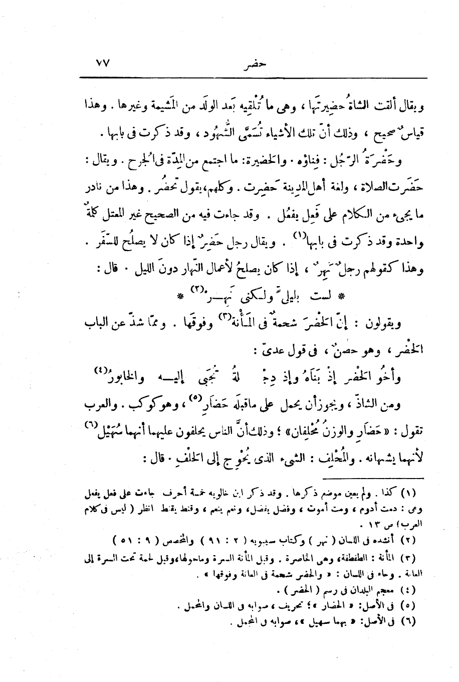 لَسْتَ بِلَيِلِيٍّ وَلَكِنِّي نَهِرْ وَيَقُولُونَ: إِنَّ الْحَضْرَ شَحْمَةٌ فِي الْمَأْنَةِ وَفَوْقَهَا. وَمِمَّا شَذَّ عَنِ الْبَابِ الْحَضْرُ، وَهُوَ حِصْنٌ، فِي قَوْلُ عَدِيٍّ:
