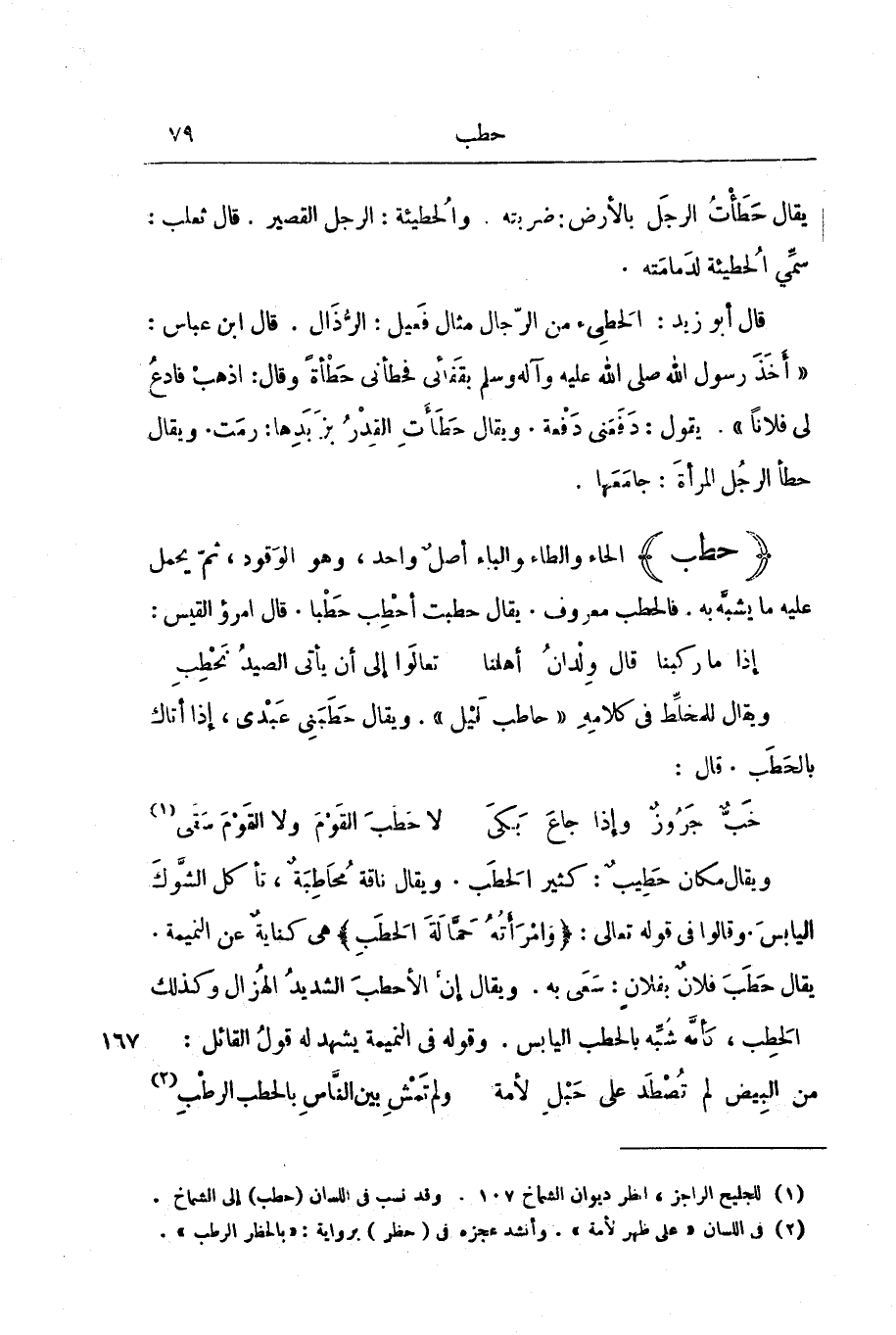 خَبٌّ جَرُوزٌ وَإِذَا جَاعَ بَكَى لَا حَطَبَ الْقَوْمَ وَلَا الْقَوْمَ سَقَى وَيُقَالُ مَكَانٌ حَطِيبٌ: كَثِيرُ الْحَطَبِ. وَيُقَالُ نَاقَةٌ مُحَاطِبَةٌ، تَأْكُلُ الشَّوْكَ الْيَابِسَ. وَقَالُوا فِي قَوْلِهِ تَعَالَى: {وَامْرَأَتُهُ حَمَّالَةَ الْحَطَبِ} [المسد: 4] ، هِيَ كِنَايَةٌ عَنِ النَّمِيمَةِ. يُقَالُ حَطَبَ فُلَانٌ بِفُلَانٍ: سَعَى بِهِ. وَيُقَالُ إِنَّ الْأَحْطَبَ الشَّدِيدُ الْهُزَالُ وَكَذَلِكَ الْحَطِبُ، كَأَنَّهُ شُبِّهَ بِالْحَطَبِ الْيَابِسِ. وَقَوْلِهِ فِي النَّمِيمَةِ يَشْهَدُ لَهُ قَوْلُ الْقَائِلِ: